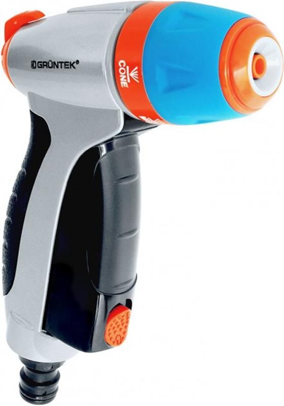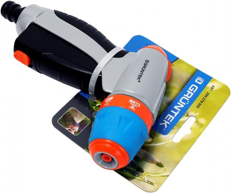 Надійний пістолет Gruntek призначений для ефективного поливу газону, клумб, чагарників, а також для миття садового інвентарю й техніки, для миття машини, для змивання бруду зі сходів і доріжок. Корпус пістолета Gruntek виготовлений із міцного металу, що забезпечує довгий термін експлуатації інструмента. На ручці передбачені прогумовані накладки, які дають пістолету змогу комфортно лежати в руці впродовж усього поливу, а також запобігають ковзанню в процесі роботи.