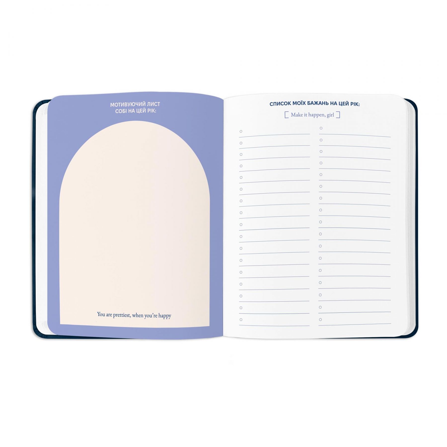 - сторінками для саморефлексії (планер містить мотивуючий лист на початку, лист вдячності — в кінці, а кожен місяць містить сторінки з запитаннями до себе)
