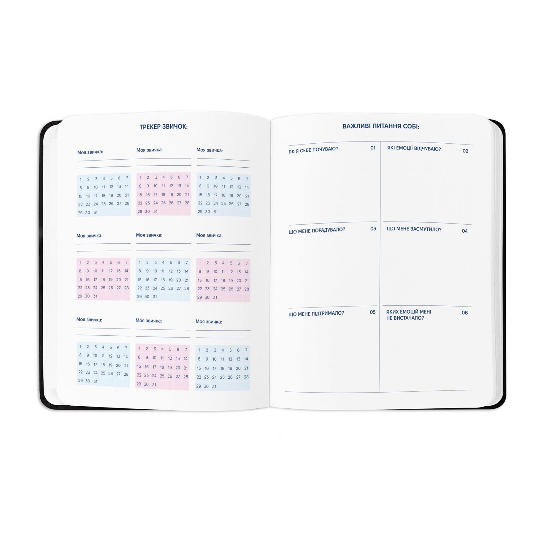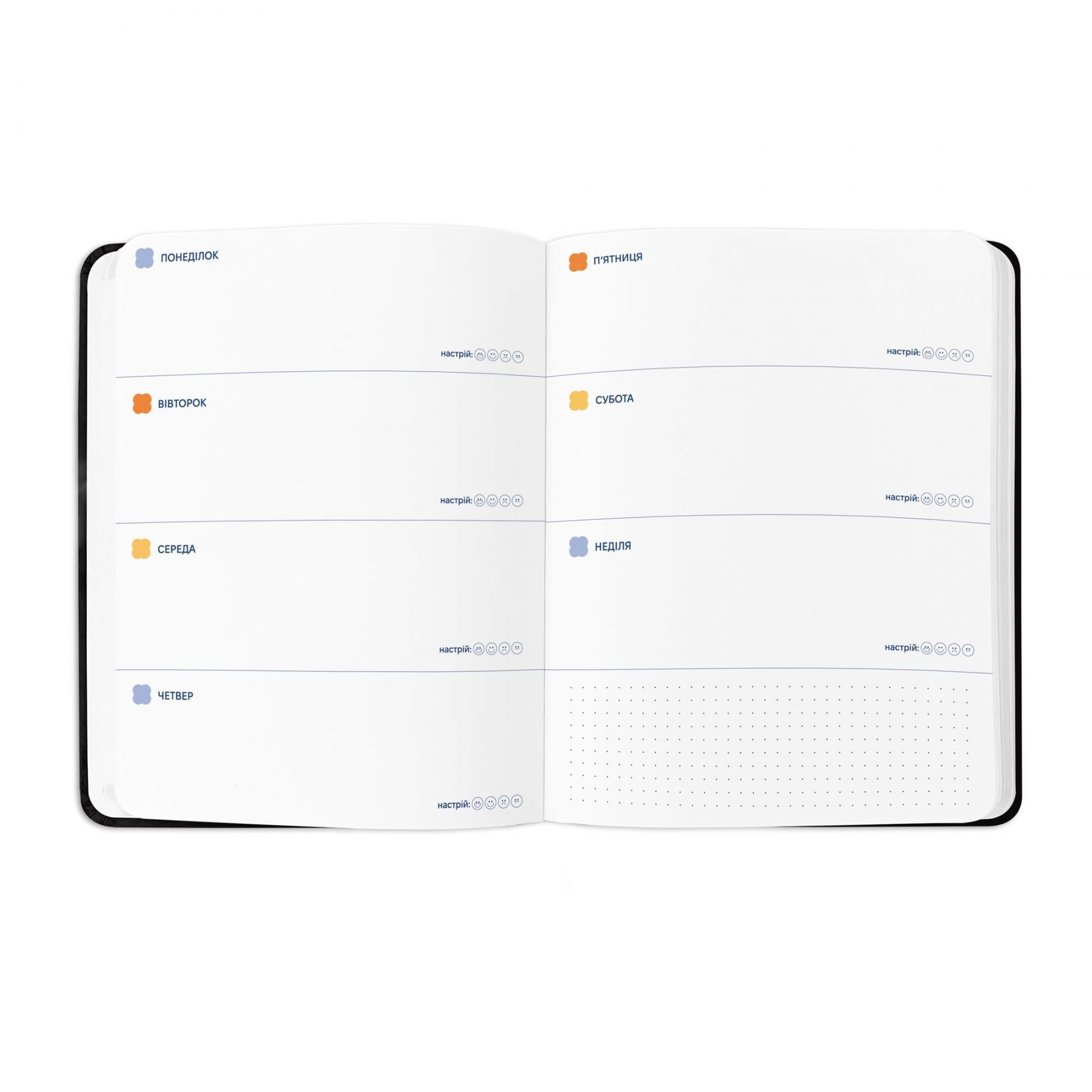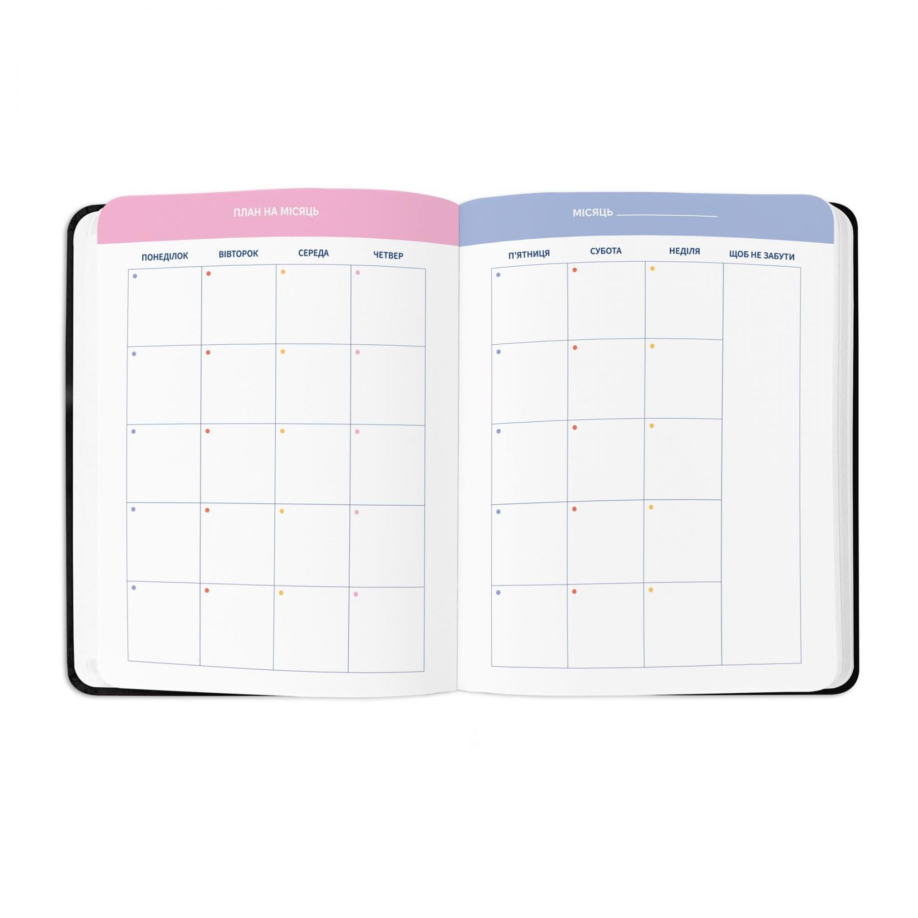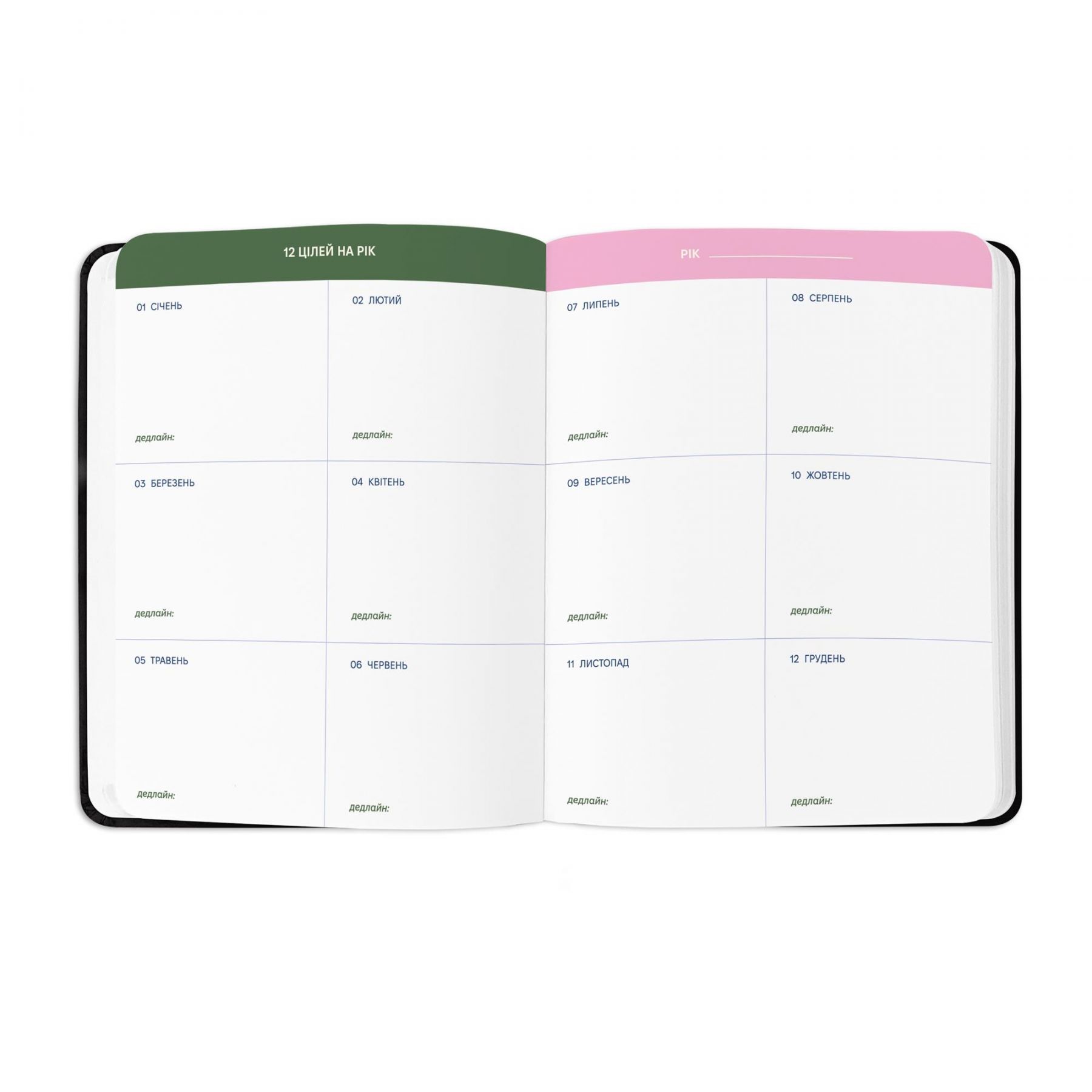 - сторінками для саморефлексії (планер містить мотивуючий лист на початку, лист вдячності — в кінці, а кожен місяць містить сторінки з запитаннями до себе)