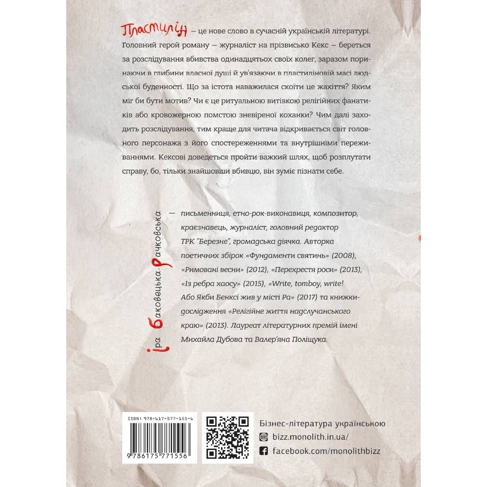 Детективний роман з елементами психологізму «Пластилін» від Іри Баковецької-Рачковської — це неординарний, сміливий погляд на сутність буття й природу самовизначення людини. Це ніби прочинені двері у світ людської душі… Сюжет захоплює з перших рядків і «тримає» аж до кінця. Лінія головного героя закликає до багатогодинних міркувань щодо людського буття й заразом розбурхує найпотаємніші глибинні почуття й найвідвертіші емоції. Отже, буде цікаво!