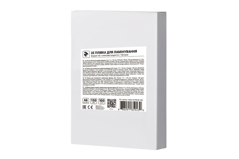 Плівка для ламінування 2E (2E-FILM-A6-150G), A6, глянцева, 150мк, 100 шт