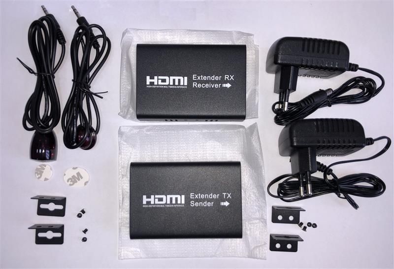 HDMI подовжувач складається з двох блоків - TX і RX. Для з'єднання блоків між собою потрібно використовувати екранований кабель кручена пара CAT-5e/6 прямого обтиску (з обох сторін однаково) з екранованими коннекторами RJ45. Для підключення кабелю кручена пара на бічній частині блоків передбачено по два RJ45 роз'єми (роз'єми підписані цифрами "1" і "2"). Дані роз'єми призначені для передачі сигналу і для обміну "службовими" даними між пристроями.