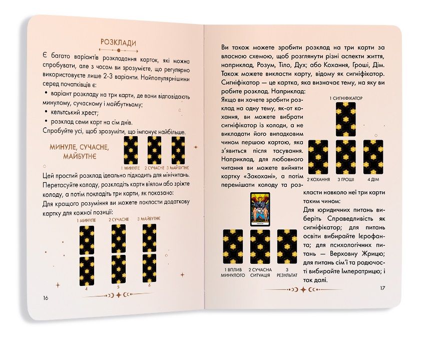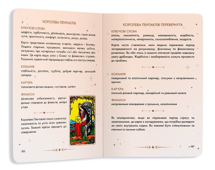 - пояснення структури колоди та детальний опис кожної з 78 карт, включно з ключовими словами та значеннями карти в прямій та перевернутій позиції