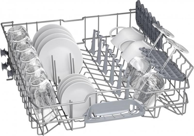 Верхній короб обладнаний потрійною рейковою системою, завдяки чому можна регулювати кошик по висоті до 5 см. Це дасть змогу розмістити високі тарілки чи інший посуд. А головне, регулювати висоту можна, коли короб вже повністю завантажений!