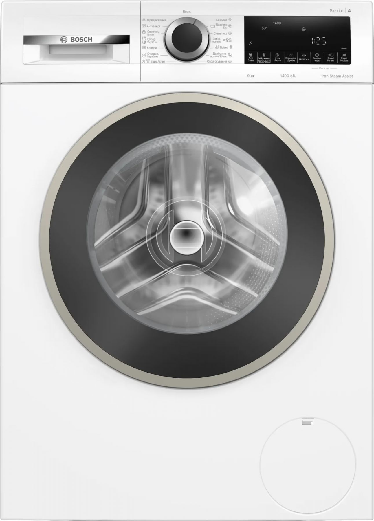 Перелік програм: Біла та кольорова білизна, Вовна/Ручне прання, Синтетика, Тонкі тканини.