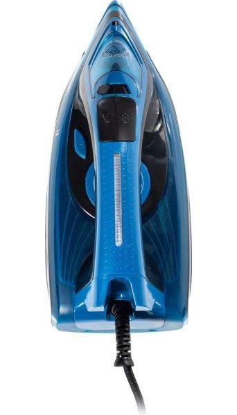 Диск регулятора температури і кнопки управління виконані з пластика. На ручці праски нанесено рівномірний візерунок у вигляді невеликих круглих степсів, посередині розташований індикатор роботи блакитного кольору. Зручне широке горлечко для заливання води з гумовим ущільнювачем.