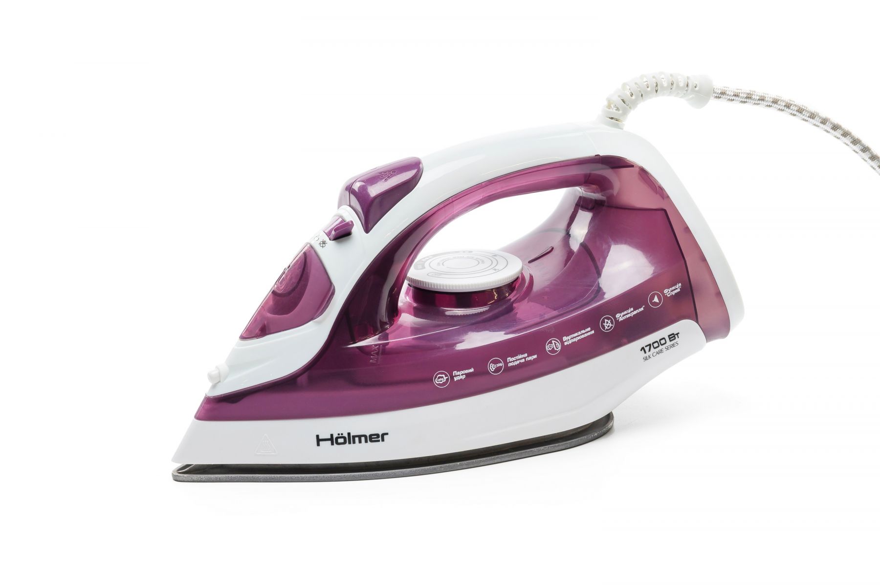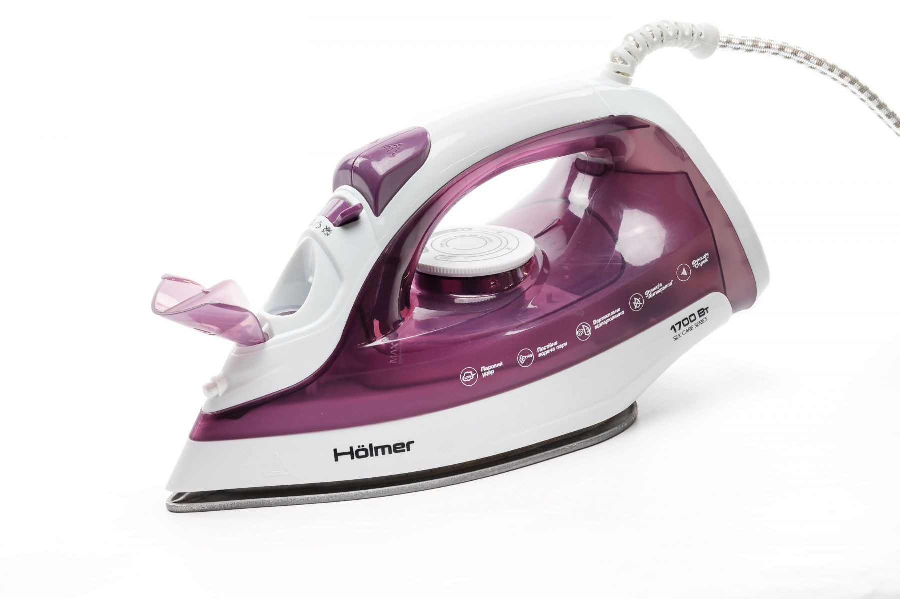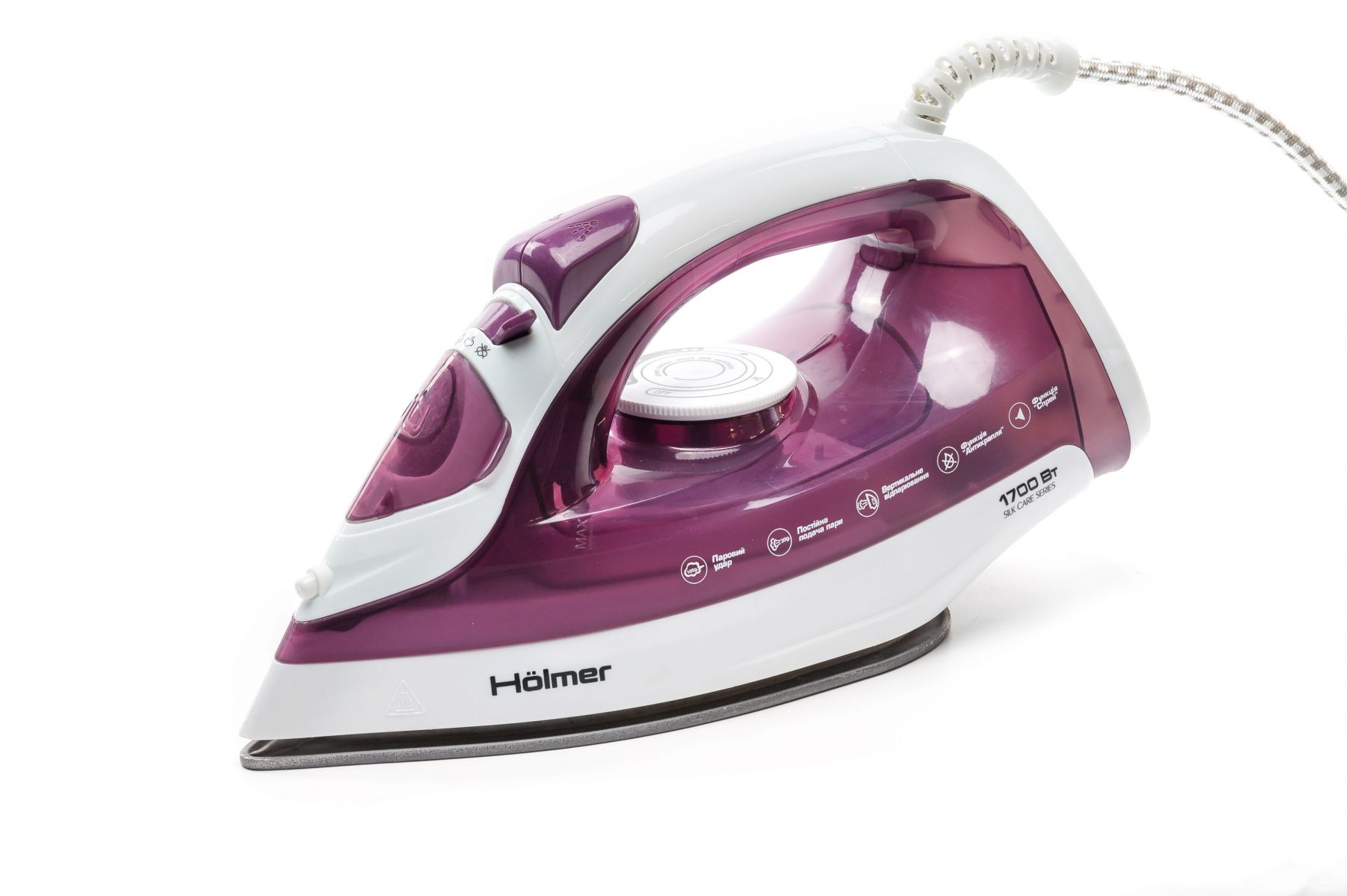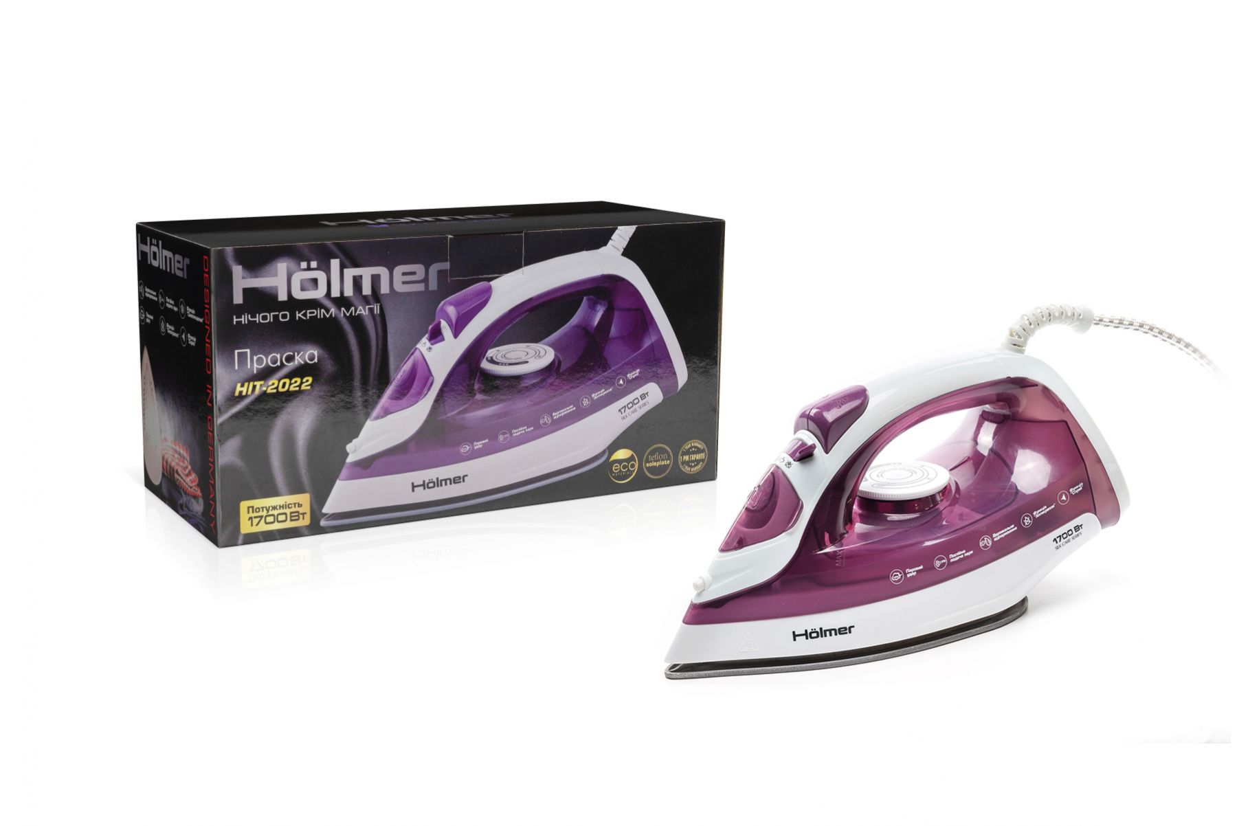 Праска Holmer HIT-2022 для сухого прасування і з парою, має потужність 1700 Вт (час нагріву max ~28 сек), паровий удар 100 г/хв, постійну подачу пари 30 г/хв. Тефлонове покриття підошви забезпечує легке ковзання тканин різних типів, розгладжуючи навіть найскладніші ділянки.
