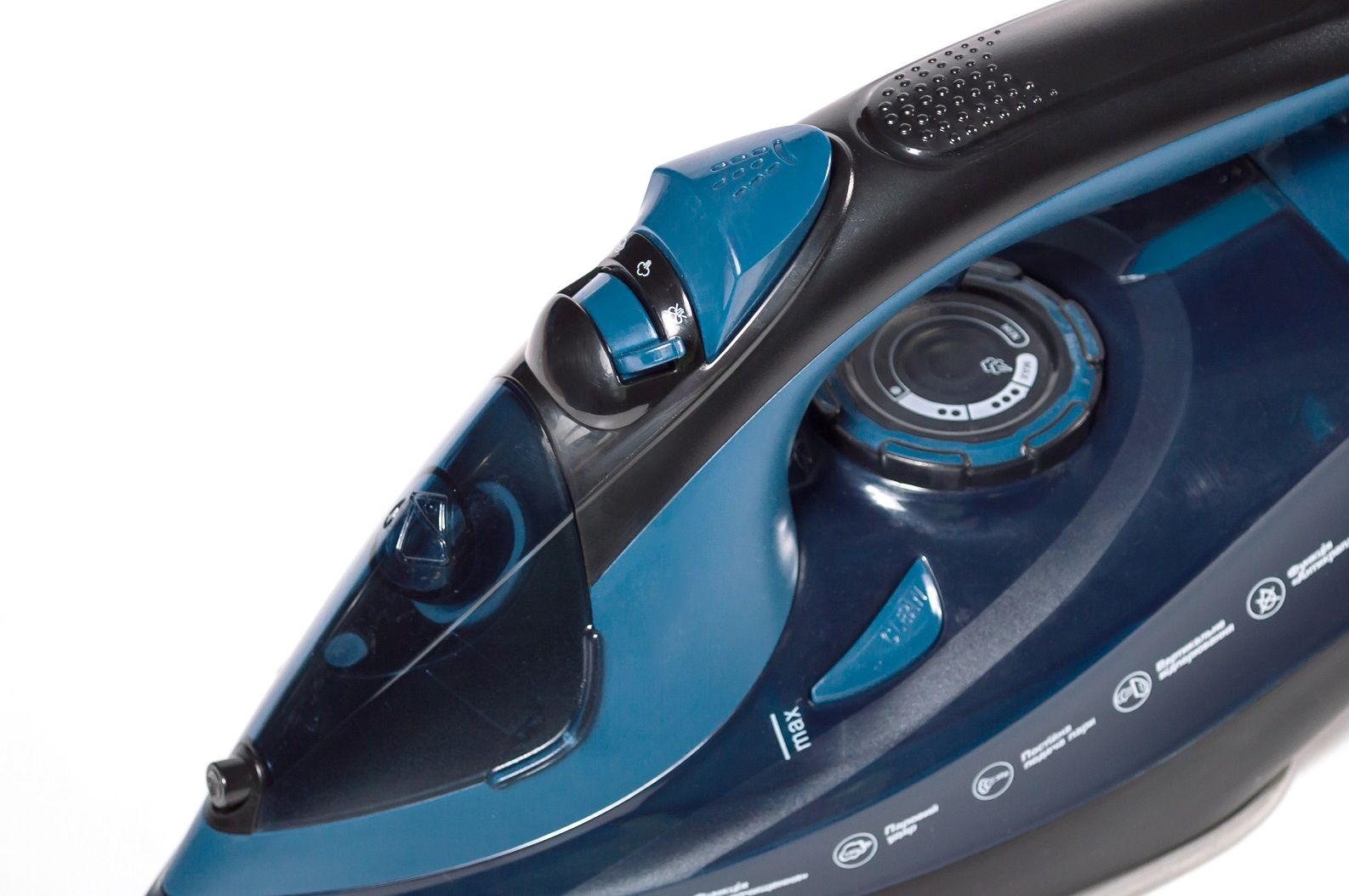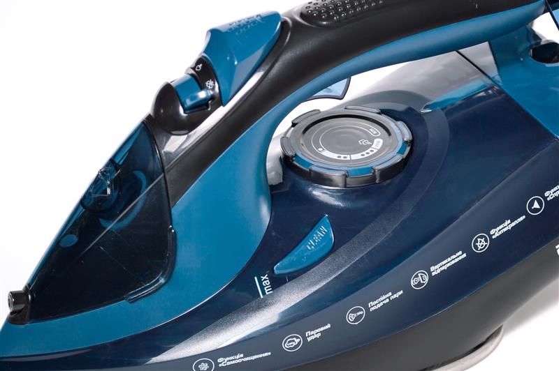 Диск регулятора температури та кнопки керування виготовлено із пластику. Зручне розташування кнопки парового удару під ручкою. На ручці праски нанесено рельєфний візерунок у вигляді елегантних крапель. Зручний широкий отвір для заливання води з гумовим ущільнювачем.