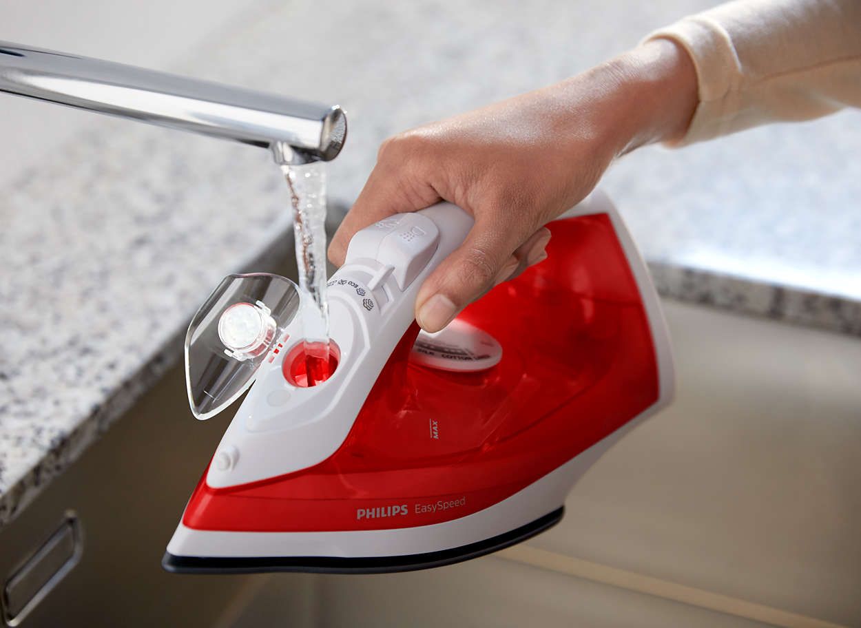 Цю парову праску можна використовувати з водопровідною водою, а слайдер очищення від накипу спрощує видалення накипу з праски. У разі використання водопровідної води для максимальної ефективності роботи парової праски Philips необхідно проводити очищення від накипу 1 раз на місяць.