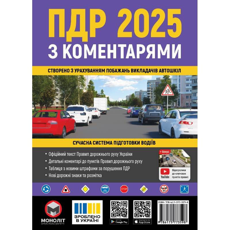 Правил дорожнього руху з найактуальнішим тестом та кольоровими ілюстраціями. Ілюстрована таблиця з новими штрафами за порушення ПДР. Основні сполучення дорожніх знаків з табличками до них.