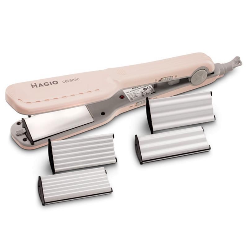 Стайлер Magio MG-175BL, потужністю в 25 Вт. Дана модель пропонує три комплекти змінних панелей, за допомогою яких Ви зможете не тільки безпечно випрямити волосся, але і оформити великі і малі хвилі. Magio MG-175BL обладнаний світловим індикатором роботи, має зручний вимикач і систему блокування пластин. Самі ж нагрівальні елементи мають зносостійке і довговічне керамічне покриття, яке відповідає за легкість ковзання і безпеку для структури волосся.