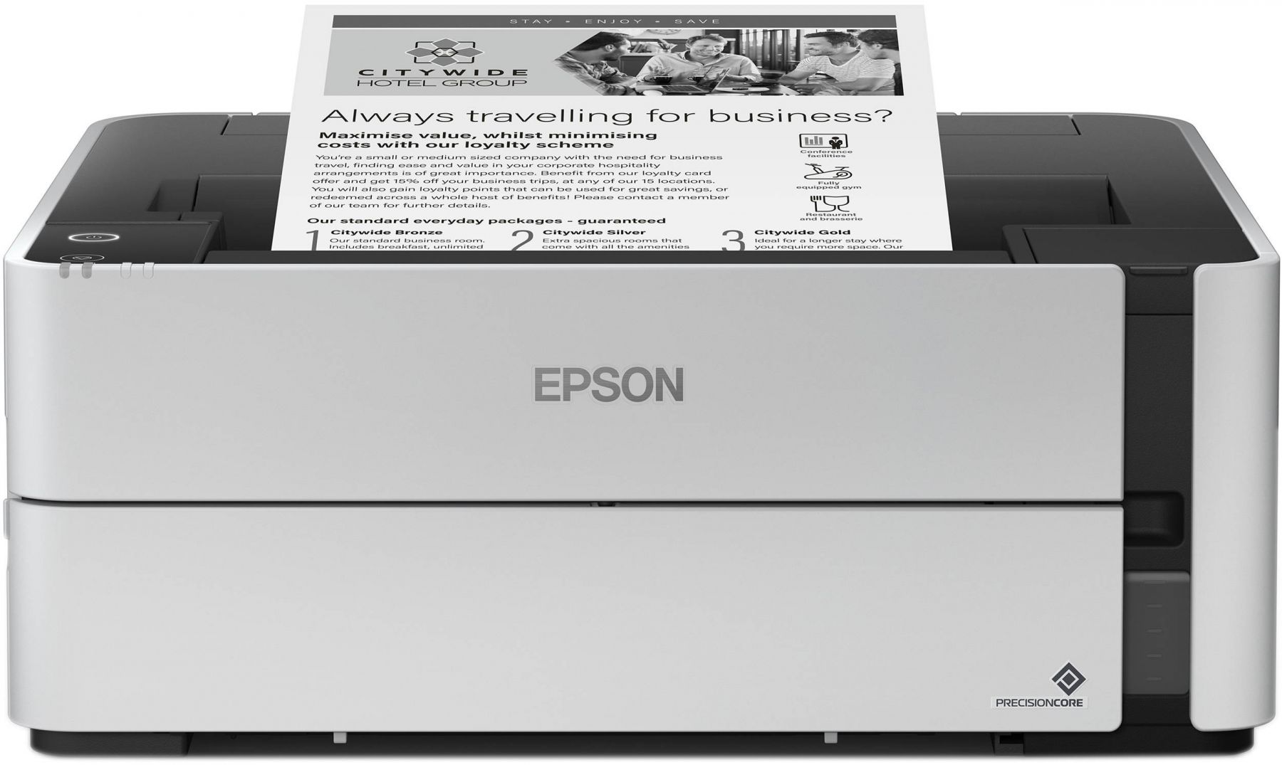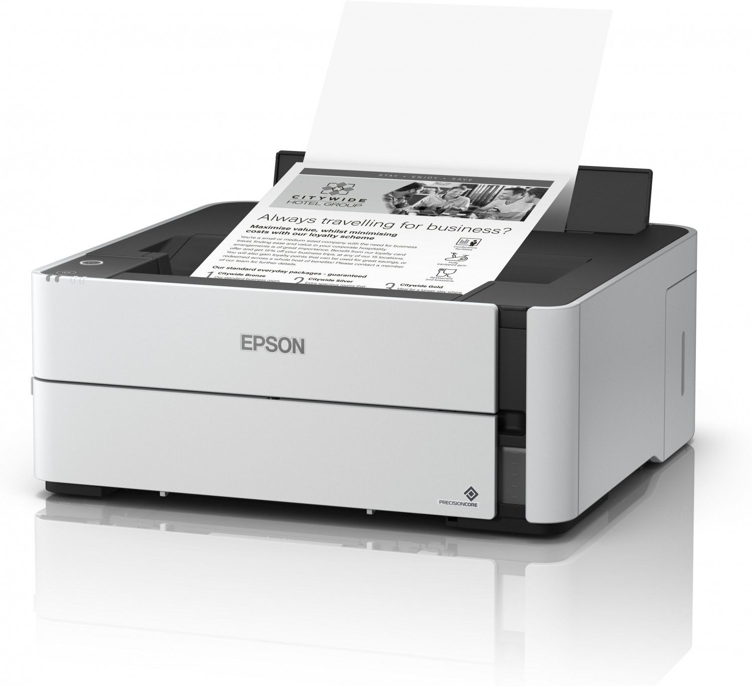 Epson M1170 - це принтер серії "Монохромна Фабрика друку Epson". Завдяки своїй унікальній конструкції Фабрика друку Epson M1170 дозволяє друкувати документи з рекордно низькою собівартість, а за рахунок використання пігментного чорнила відбитки миттєво висихають і не розмазуватися при попаданні води або механічній дії. Крім того, цей пристрій має функцію автоматичного двостороннього друку, а також автоподатчика для сканування документів.