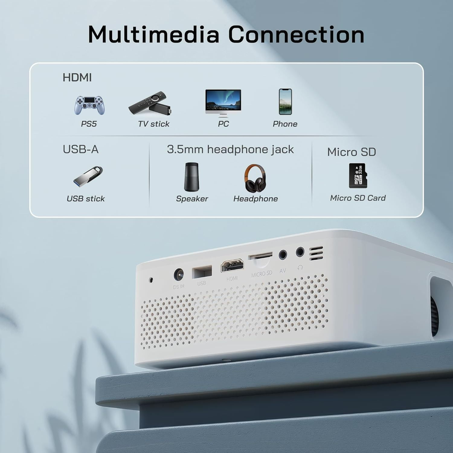 Проектор підтримує стабільне дротове підключення через HDMI, для чого може знадобитися додатковий адаптер. Опціонально доступне підключення Wi-Fi за допомогою адаптера (не входить у комплект). WOLFANG WP02 підтримує різні режими проекції: спереду, ззаду та на стелю, що робить його зручним для використання в будь-яких умовах.