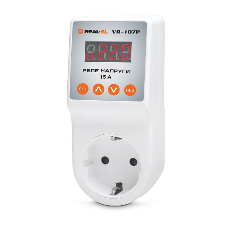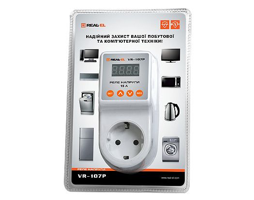 Реле напруги REAL-EL VR-107P призначене для захисту підключених до нього побутових електроприладів (холодильників, пральних машин, комп"ютерів, відео-, аудіотехніки та ін.) dід неприпустимих відхилень напруги живлення в мережі.