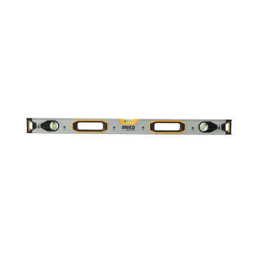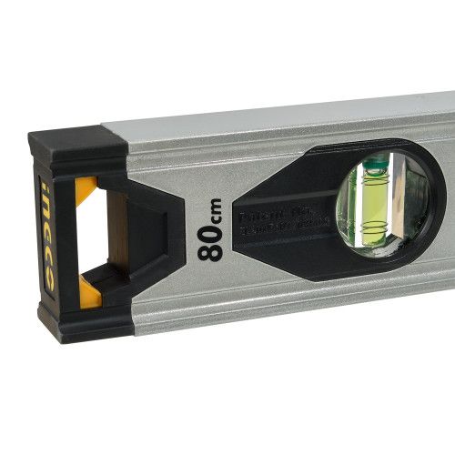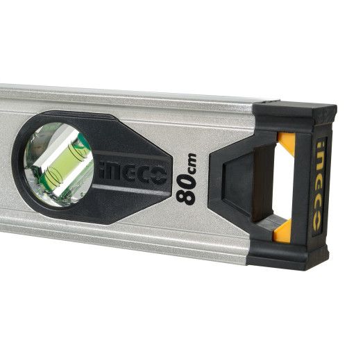 Будівельний алюмінієвий рівень 80 см INGCO INDUSTRIAL оснащений трьома очками та призначений для виявлення відхилення поверхні по горизонталі й вертикалі.