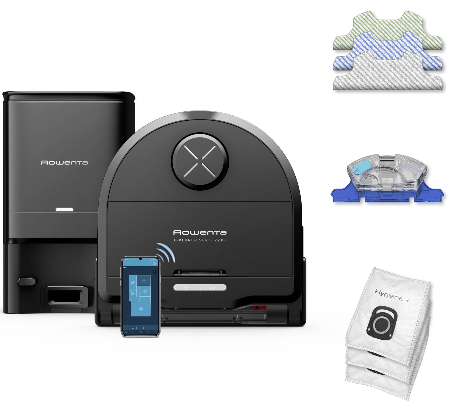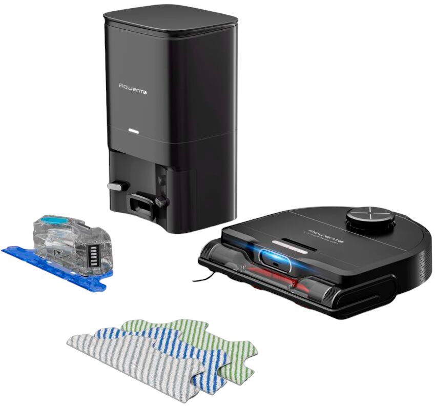 Комплектація:робот-пилосос, вібруючий резервуар для води з електронним контролем рівня води, комплект насадок з мікрофібри (стандартна біло-сіра для всіх підлог, біло-синя для стійких плям, біло-зелена для використання без води для видалення дрібних частинок завдяки електростатичному заряду), 3 мішки Hygiene+, док-станція, інструкція, гарантійний талон