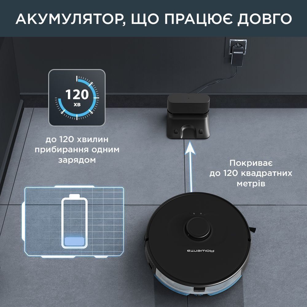 Довготривалий заряд батареї забезпечує 120 хвилин продуктивного прибирання, щоб охопити до 120 квадратних метрів простору - цього достатньо, щоб забрати весь будинок на одному заряді.