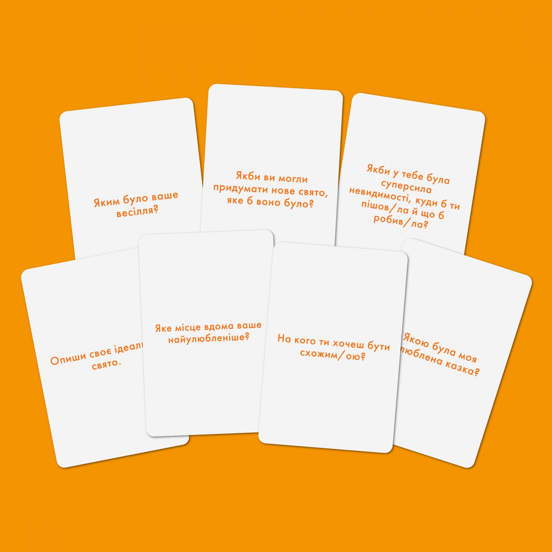 У цій грі є 150 карток із запитаннями, що поділені на 3 категорії: батьки, діти та загальне. Тобто, відповідати на запитання будуть усі.