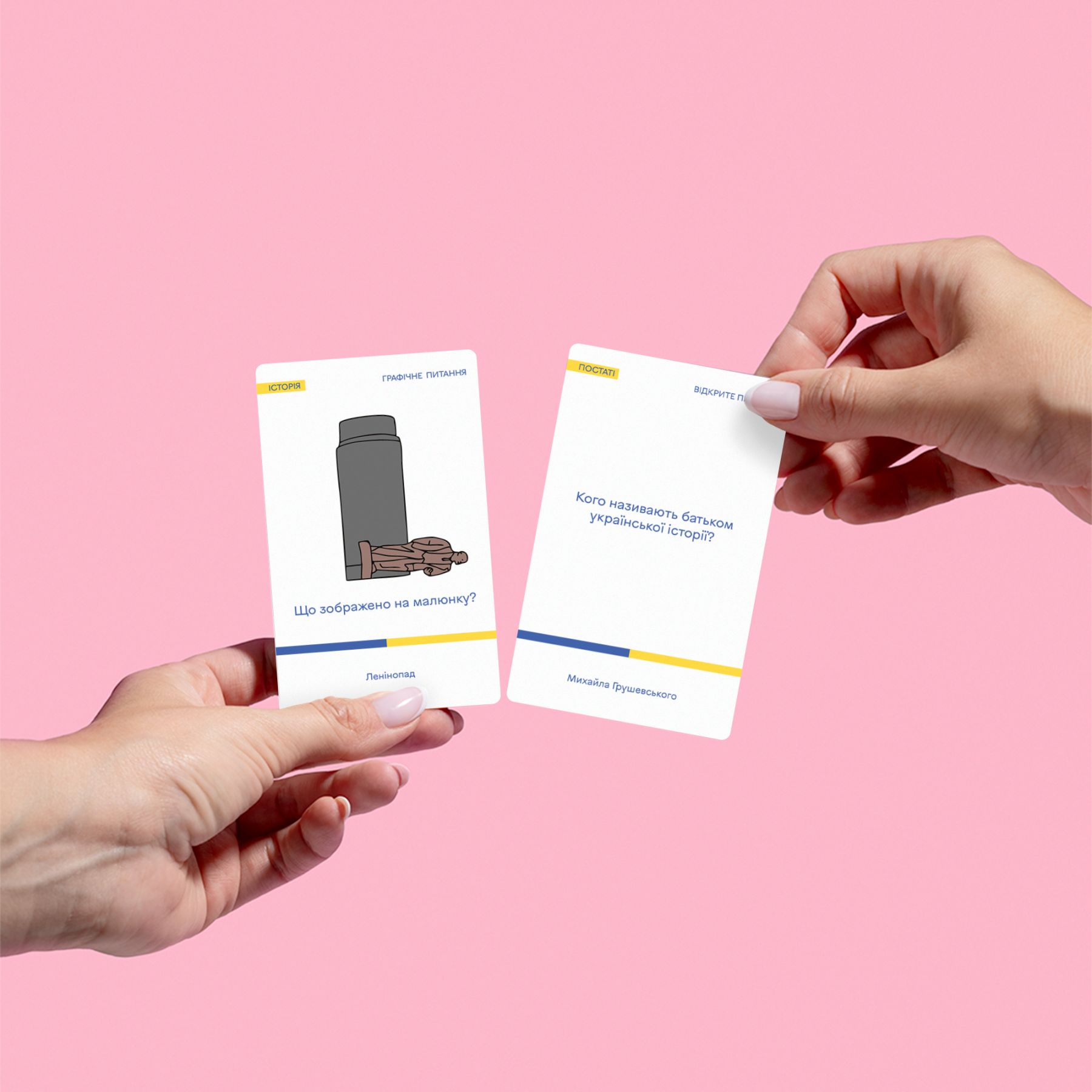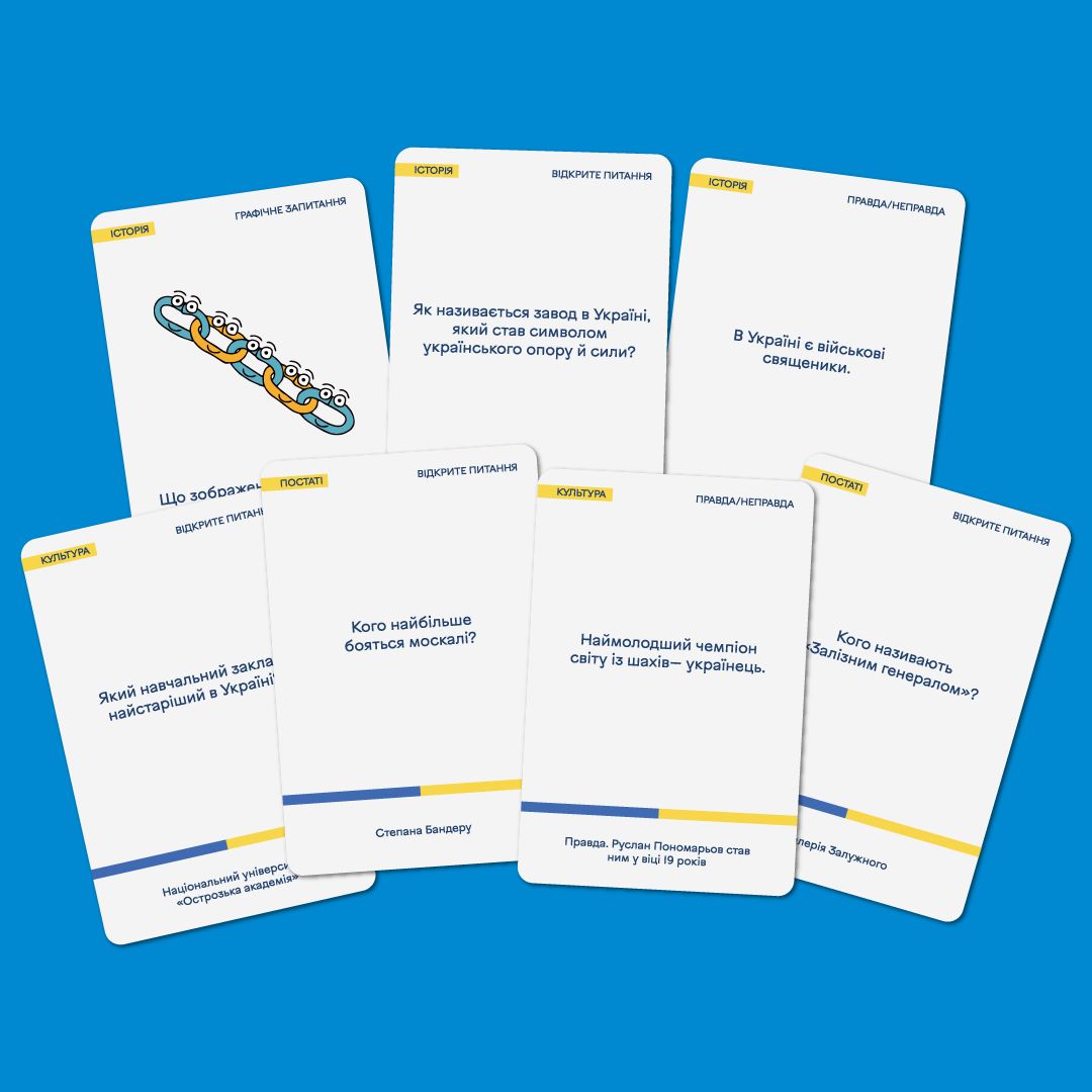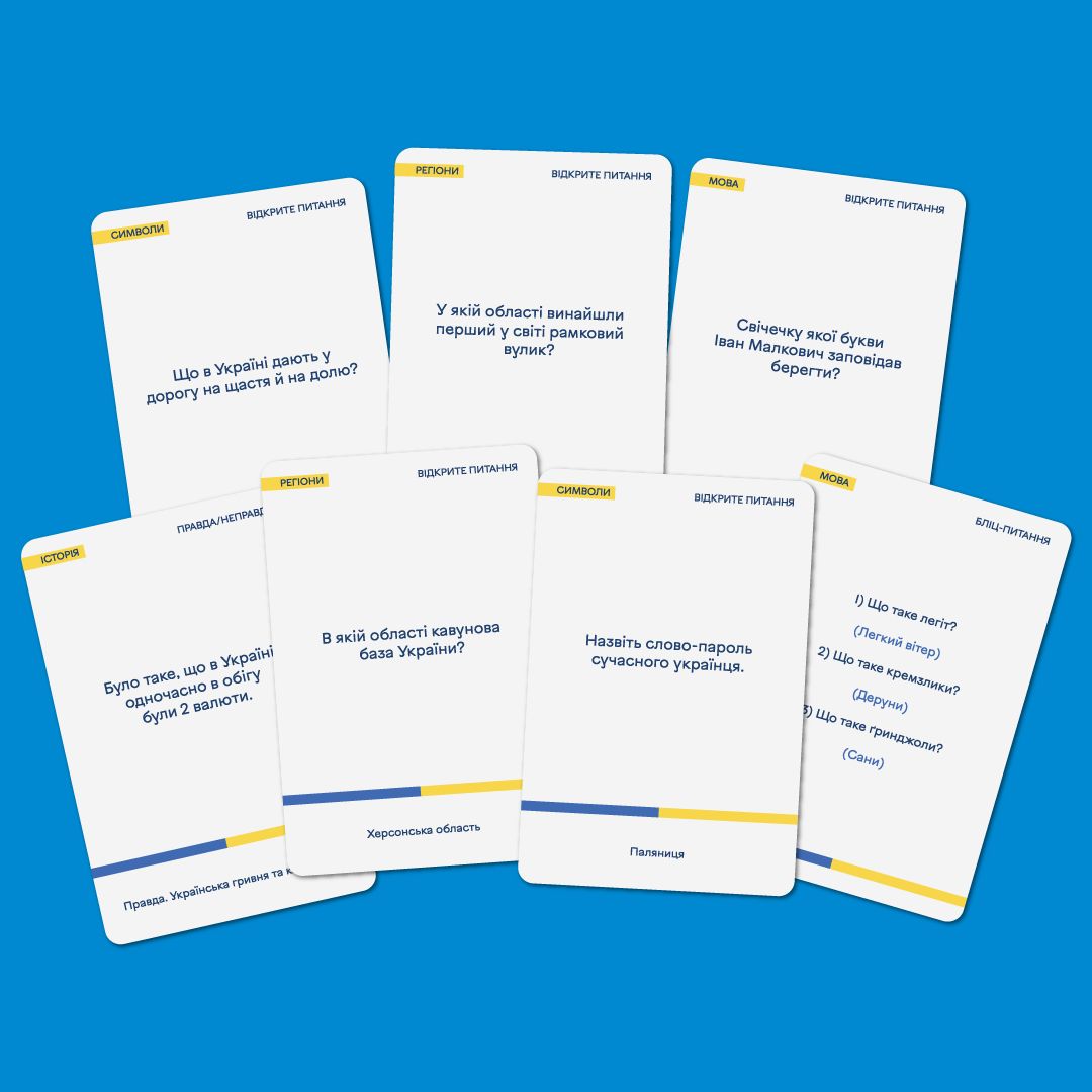 Ця гра підійде і для гучної компанії, і для спокійного вечора вдвох. Бо ж головне — дізнатися більше про Україну. Про її історію, мову й культуру, трошки познайомитися із постатями й географією, а ще повпізнавати символи.