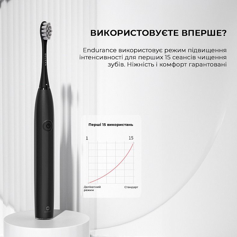 Зубна щітка Oclean Endurance – справжній витвір технологічного мистецтва. Виготовлений з якісних матеріалів та має два кольори: класичний чорний колір та чистий білий. Таким чином можна зручно розділяти щітки для різних членів сім’ї.