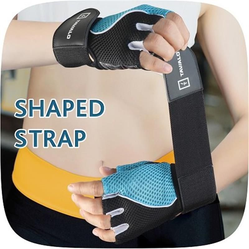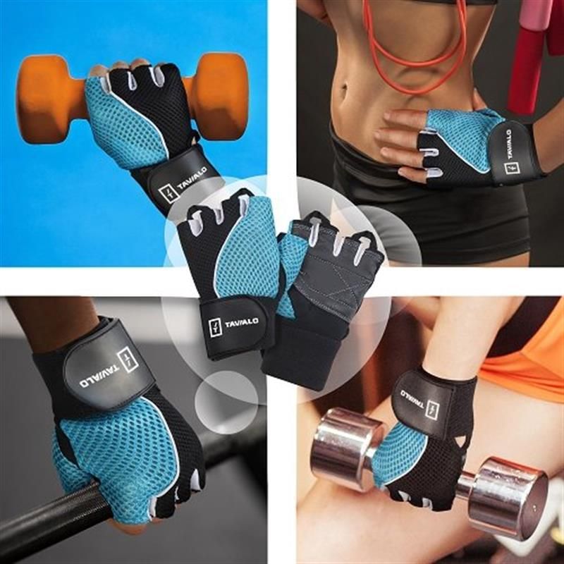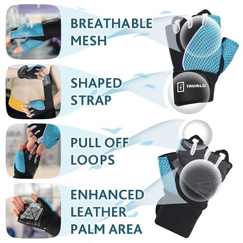На долонях рукавички посилені шкіряними вставками, що запобігає ковзанню спортивного снаряда в руках. Зверху покриті сіточкою, що пропускає повітря, завдяки чому рука менше потіє для комфортного використання протягом всього тренування. На руці рукавичка надійно фіксується за допомогою ремінця на липучці, який підлаштовується під діаметр руки. Рукавички Tavialo Black-Blue S легко знімаються з руки за допомогою 2-х петель.