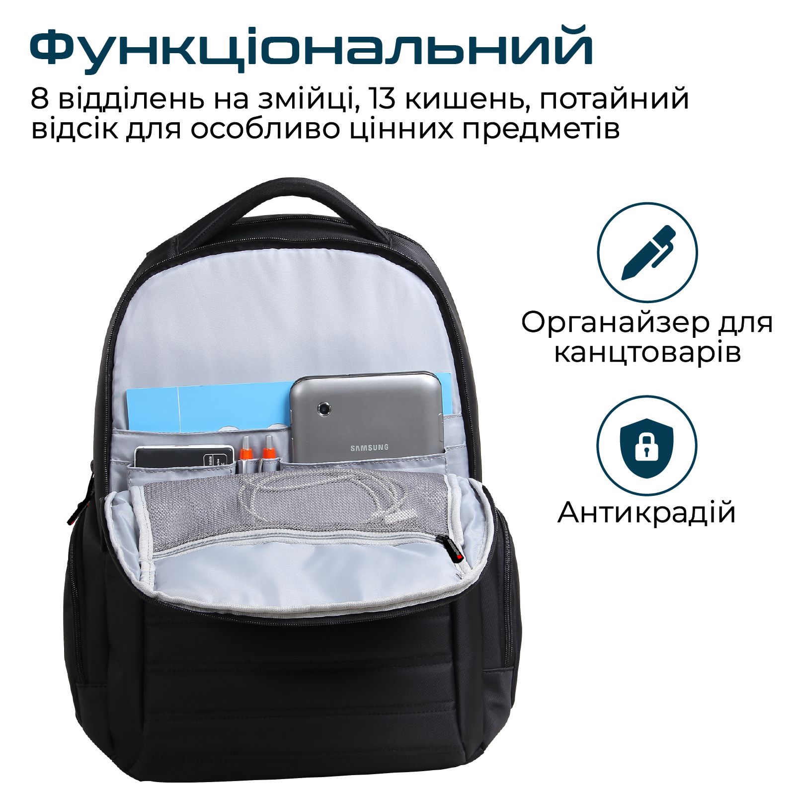 Функціональний: 8 відділень на змійці, 13 кишень, потайний відсік для особливо цінних предметів, а також органайзер для пластикових карток, ручок і ґаджетів.