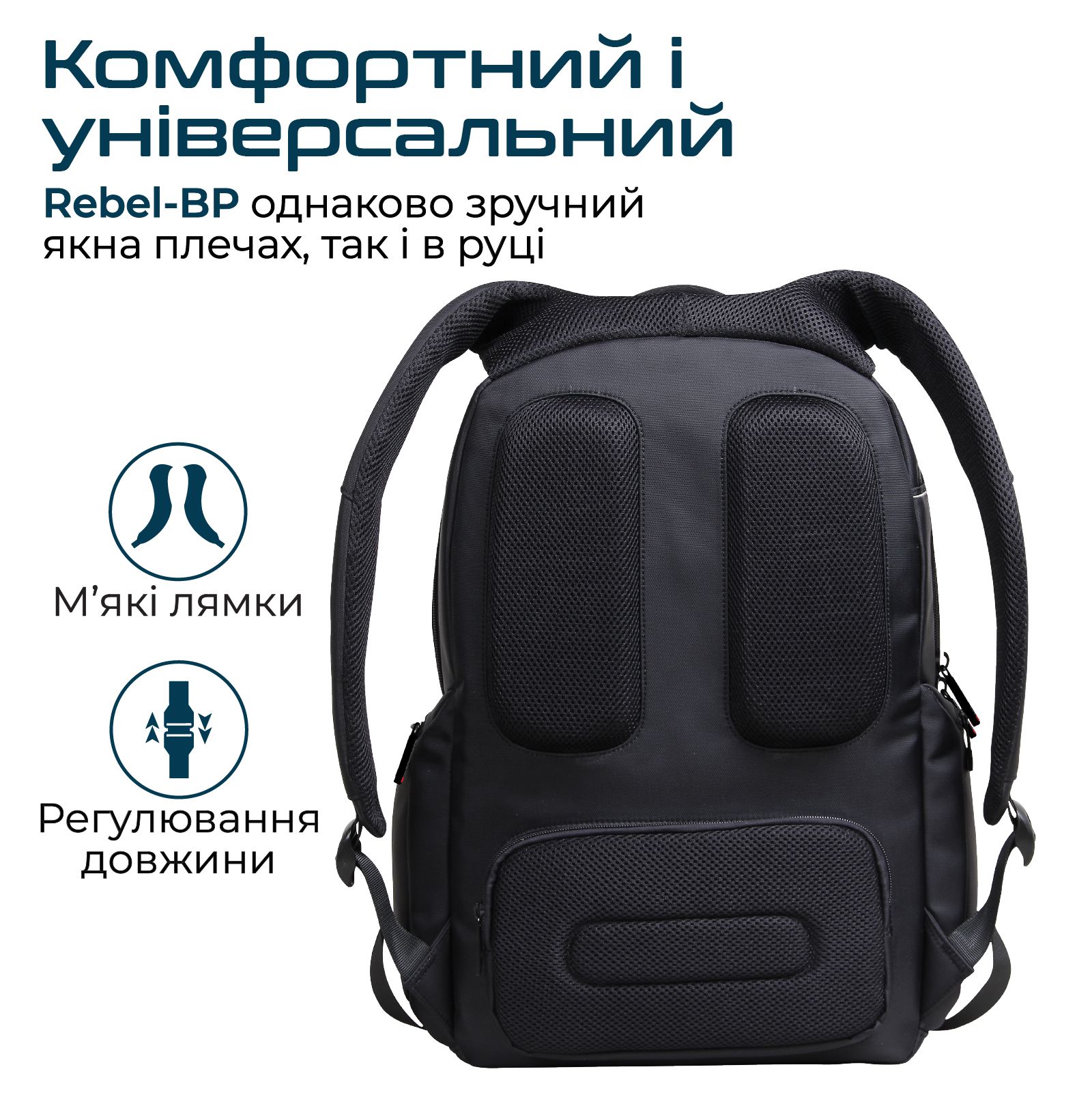 Місткий: Rebel-BP має видатний, для свого форм-фактора. Він з легкістю вміщує ноутбук 15.6", документи формату А4, контейнер з їжею, спортивний одяг та інші повсякденні речі.