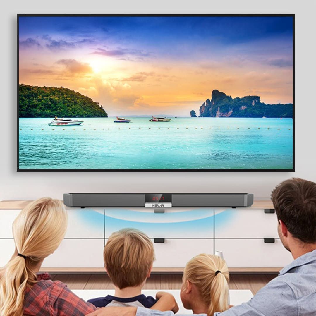 34 дюймова звукова панель Deep Bass: звукова панель має повночастотний гучномовець потужністю 40 Вт (4 * 10 Вт) і 2 басові мембрани з чітким стереозвуком. Не спотворює звук навіть при максимальній гучності. Система об’ємного 3D звуку: розроблена за технологією DSP для чіткості та точності. Підтримує 3 режими звуку: режим новин, режим музики, режим фільму. Бездротове або дротове підключення: приєднати звукову панель до інтерактивної панелі, смарт-телевізора, або інших мобільних пристроїв за допомогою вбудованого приймача Bluetooth. Soundbar також оснащений допоміжним роз’ємом 3,5 мм, портом USB та оптичними/RCA-підключеннями, що працює з більшістю пристроїв.
