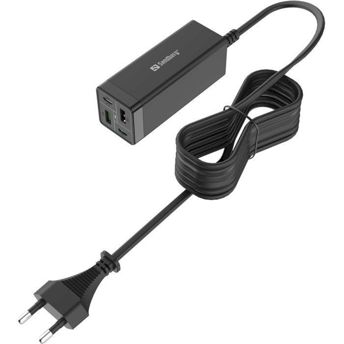 Зарядний пристрій Sandberg 4-in-1 Charger — це зручний настільний зарядний пристрій. З його допомогою можна зарядити ноутбук та мобільне обладнання. За наявності 2 роз’ємів USB-C PD та 2 роз’ємів USB-A QC можна одночасно заряджати до 4 пристроїв, що дозволить уникнути плутанини проводів.