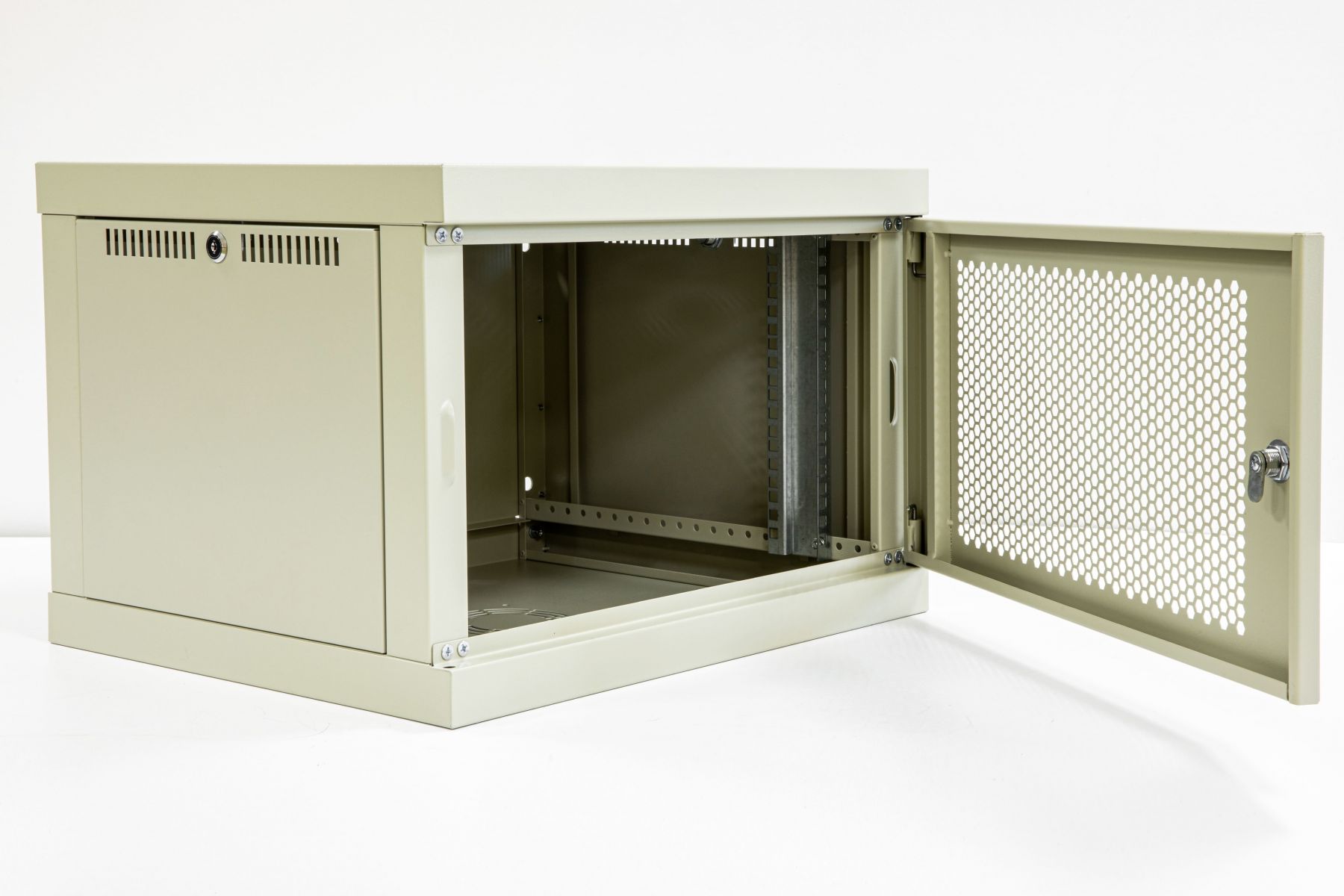 Зварні рами із сталі 1 мм. Складання шаф максимально спрощене завдяки заздалегідь запресованим кріпильним елементам. Для складання досить викрутки. 19" Монтажних рейок встановлюються з кроком 20 мм в круглі отвори. Немає проблеми з вирівнюванням вертикалі рейок, як в шафах з овальними кріпленнями. Передні двері встановлені на петлях-шпінгалетах. Двері не провисають і не бовтаються, шпінгалети вставлені в пластикові Втулки, що повністю прибирає люфт дверей. Полотно дверей посилене, немає відчуття м’якості і гнучкості дверей при відкриванні. У базовому варіанті є 2 місця під установку вентиляторів. Здатність навантаження до 120 кг Передні двері з перфорацією шестигранником.Площа відкритого простору 63% .