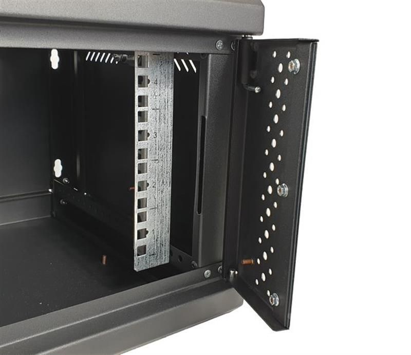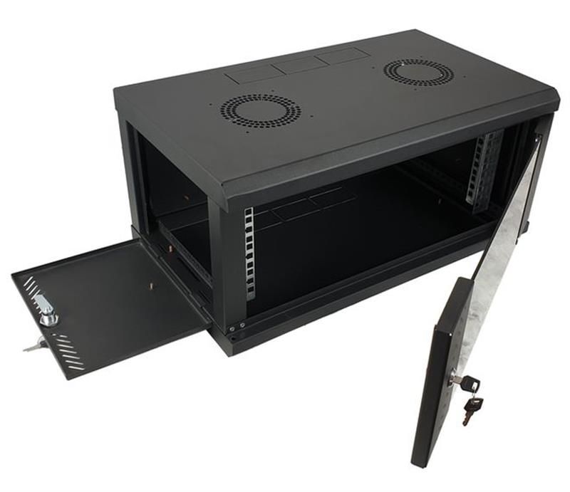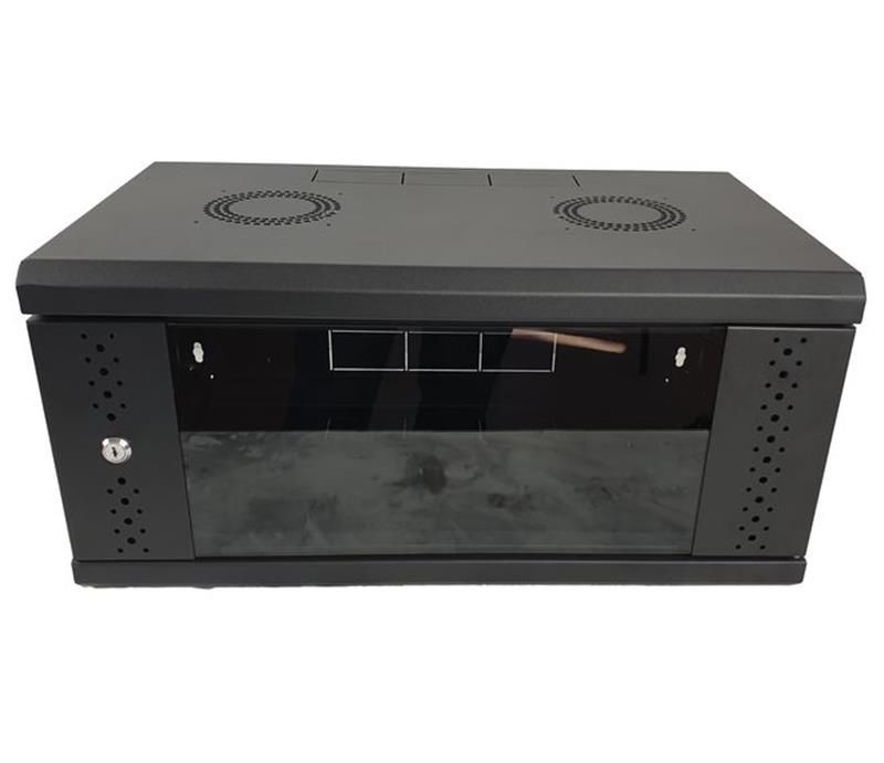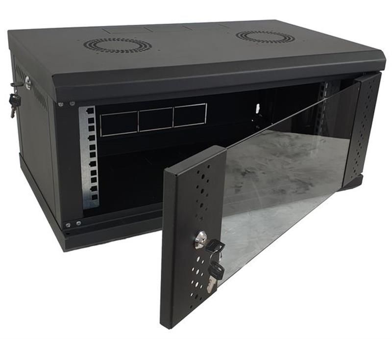 Шафа настінна 6U від EServer. Привабливі зовнішній вигляд, двері із загартованого скла, чорний колір. У верхній кришці шафи передбачено два місця для встановлення вентиляторів 120 мм. Зовнішня висота складає 370 мм, зовнішня глибина – 500 мм. У шафу можна встановити обладнання завглибшки до 435 мм. Бічні двері – знімні на замках. Здійснено підготовку під заземлення (в усіх частинах шафи встановлено болти під заземлення).