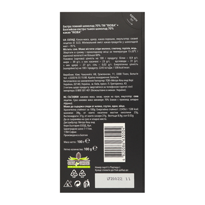 Склад: Какао-маса*, цукор, какао-порошок*, емульгатор: соєвий лецитин (Е 322). Мінімальний вміст какао-продуктів у шоколадній масі – 70 %. Містить: сою. Може містити сліди молока, глютену, горіхів, яєць.
