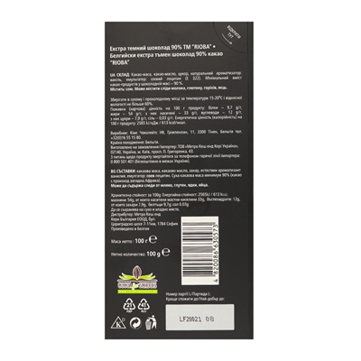 Склад:какао-маса*, какао-масло*, цукор, натуральний ароматизатор: ваніль, емульгатор: соєвий лецитин (Е322). Мінімальний вміст какао-продуктів у шоколадній масі – 90 %. Містить: сою. Може містити сліди молока, глютену, горіхів, яєць.