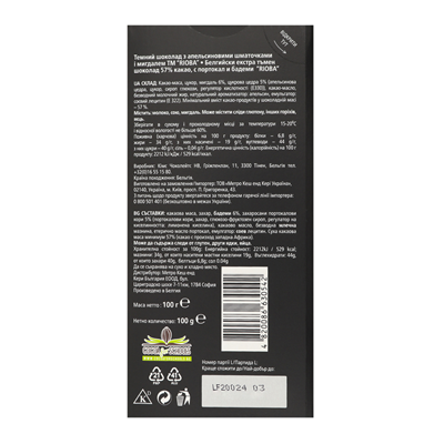 Склад:какао-маса*, цукор, мигдаль 6%, цукрова цедра 5% (апельсинова цедра (2,65%), цукор, сироп глюкози, регулятор кислотності (E330)), какао-масло*, безводний молочний жир, натуральний ароматизатор: апельсин, емульгатор: соєвий лецитин (Е322). Мінімальний вміст какао-продуктів у шоколадній масі – 57 %. Містить: молоко, сою, мигдаль. Може містити сліди глютену, інших горіхів, яєць.
