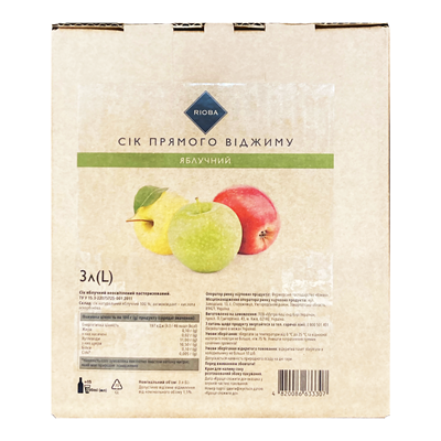 Сік яблучний неосвітлений пастеризований 3 л. Прямого віджиму. Склад: сік яблучний 100%, антиоксидант-кислота аскорбінова. Харчова (поживна) цінність у 100 г продукту: 46 ккал. Харчова (поживна) цінність у 100г продукту: Білки - 0,1 г., Жири - 0,1г. Умови зберігання: зберігати за температури від 0°С до 25°С та відносної вологості повітря не більше, ніж 75%.