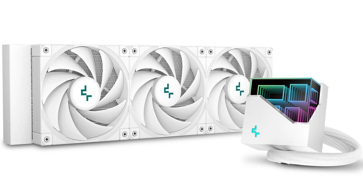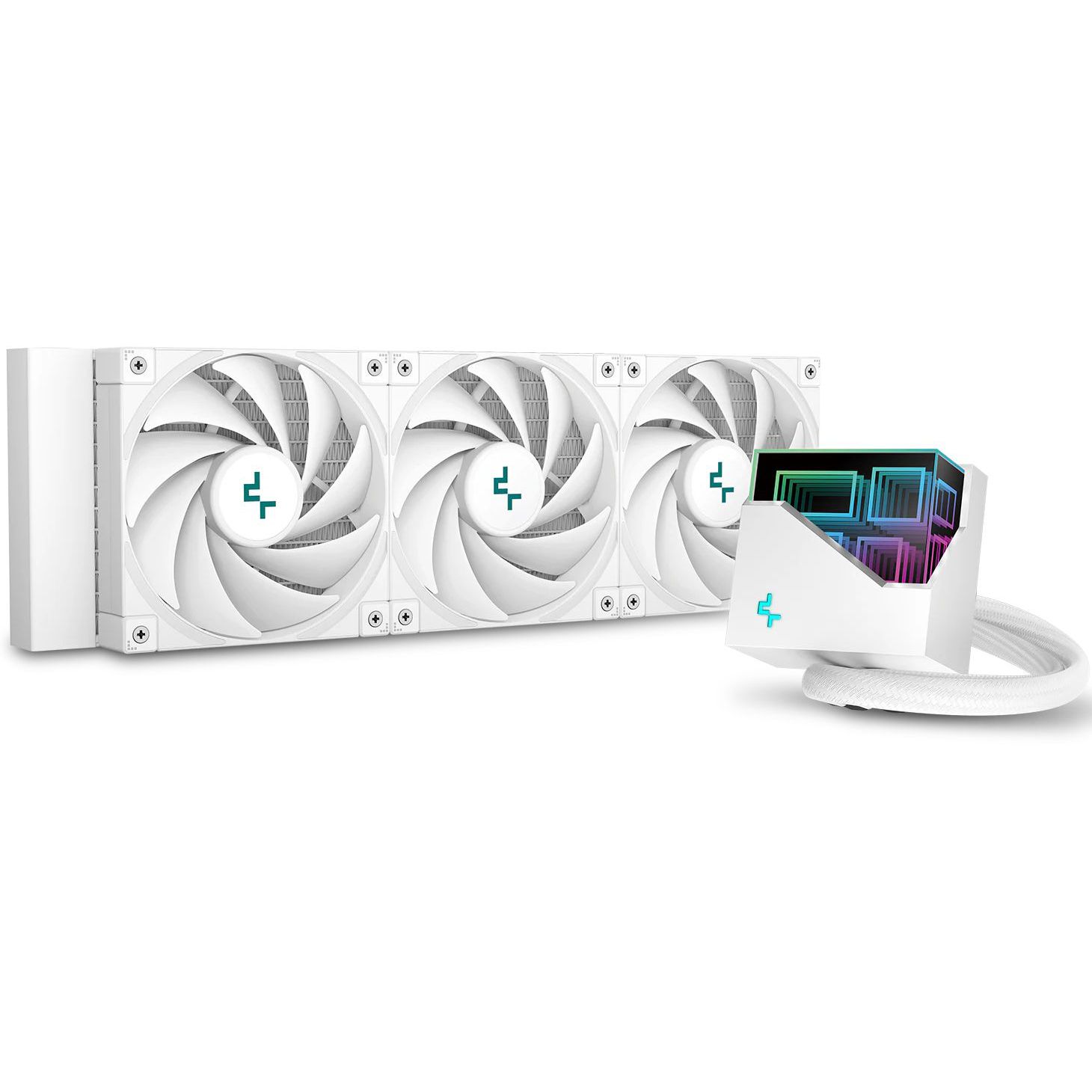 Високопродуктивний рідинний процесорний кулер DeepCool LT720 WH забезпечує потужне розсіювання тепла завдяки 360-міліметровому радіатору, трьом точно налаштованим вентиляторам FK120 і багатовимірній нескінченній дзеркальній верхній кришкі, представленій у чистому повністю білому дизайні.