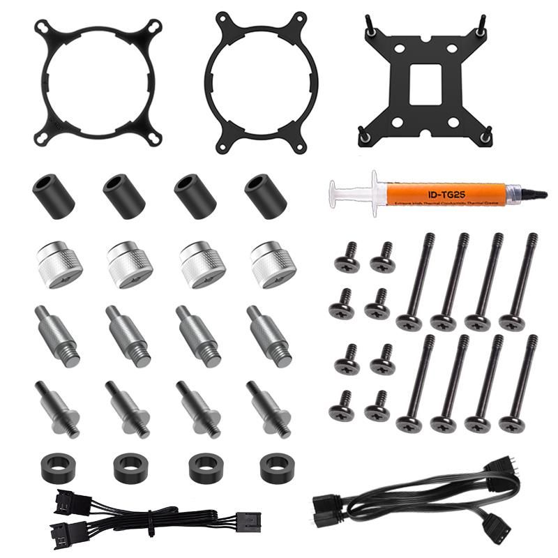 Система рідинного охолодження ID-COOLING включає мідний водоблок, об’єднаний із помпою в одному корпусі. Водоблок із помпою приєднані за допомогою шлангів до радіатора, виробленого з алюмінію. За обдування радіатора відповідають два 120-мм вентилятори.
