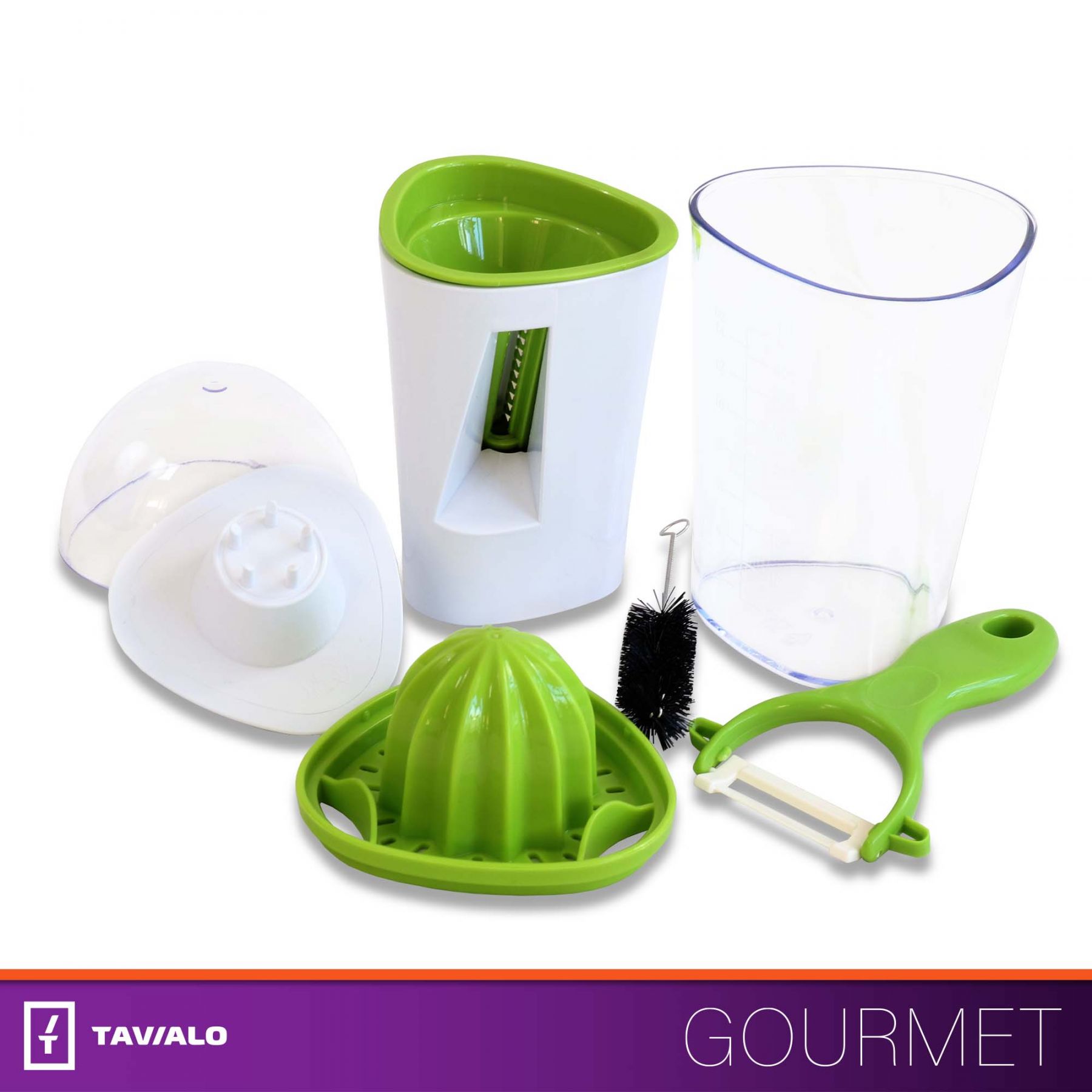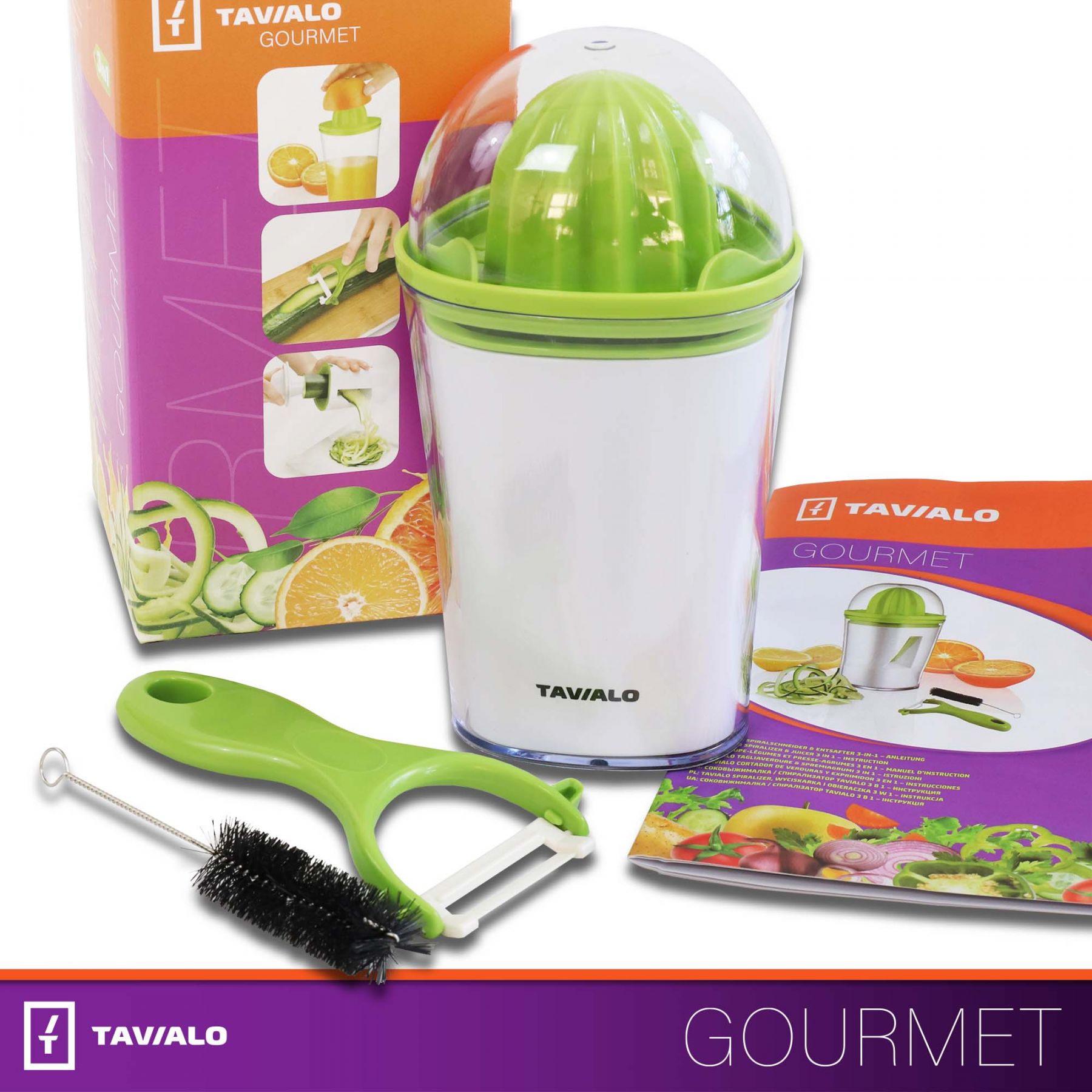 Cоковитискач / спіралізатор Tavialo дозволяє готувати свіжий апельсиновий сік або лимонад, а також овочеві спагетті. Ударостійка ємність з ABS-пластику дозволяє одночасно збирати сік, так і овочеві спагетті. Повністю розбирається для легкої очистки.