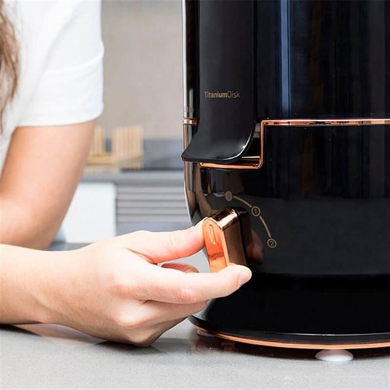 Завдяки його конструкції і швидкості обертання 19000 об/хв вичавляється на 30% більше соку. Крім того, відрізний диск покритий титаном, що забезпечує більш міцну твердість і гостроту.