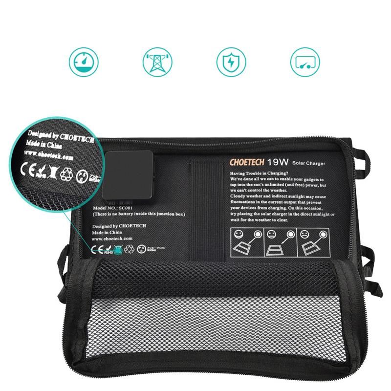 Ви можете легко заряджати пристрої завдяки 2 портам USB. Вам більше не доведеться турбуватися про неможливість зарядити свої пристрої! З Choetech SC001 ви використовуватимете сонячну енергію, яка швидко перетворюється на електрику завдяки інноваційній сонячній панелі SolarPower. Зарядний пристрій SC001 потужністю 19 Вт, оснащений технологією Auto Detect, забезпечує найшвидшу зарядку і в той же час вражає своєю ефективністю. Він також дуже легкий завдяки спеціальному дизайну, а використання спеціальних матеріалів робить зарядний пристрій дуже міцним та стійким до будь-яких несприятливих умов. Насолоджуйтесь комфортом та свободою підзарядки своїх пристроїв під час походів та пригод на відкритому повітрі!