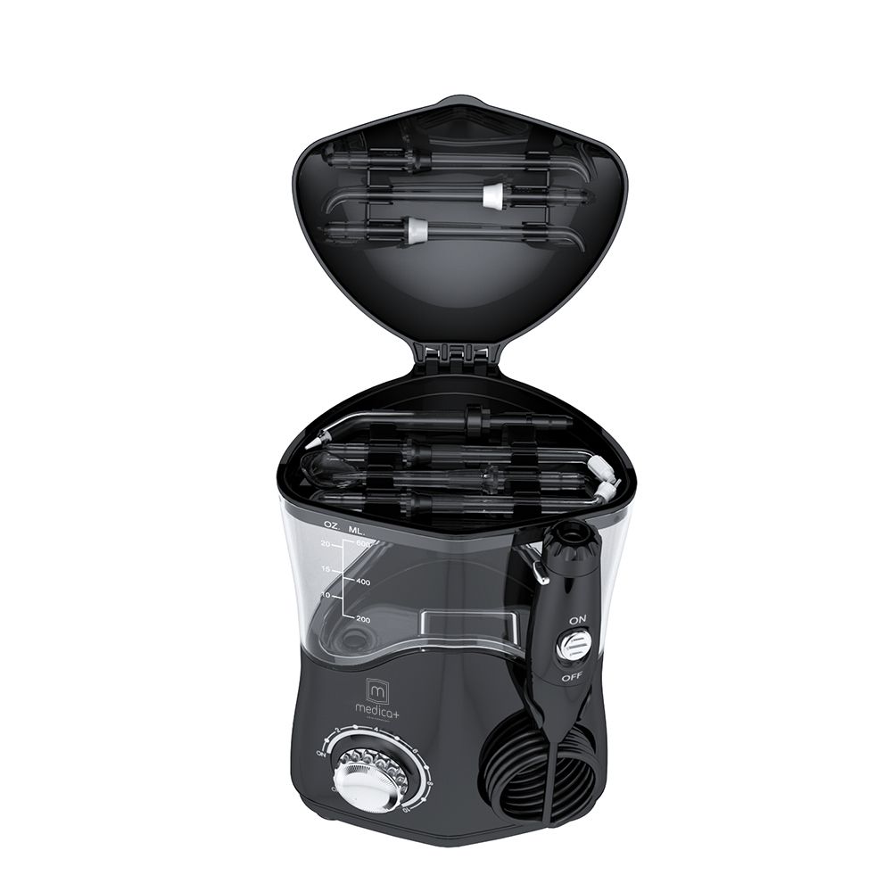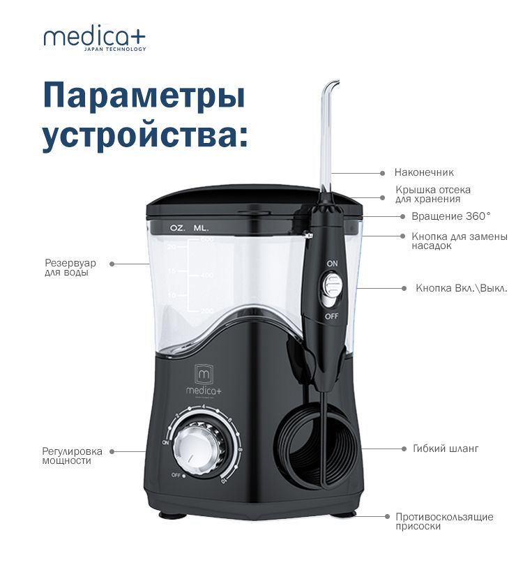 Стаціонарний іригатор MEDICA + працює за принципом подачі потужного спрямованого потоку води за допомогою спеціального наконечника, який може обертатися на 360 ℃. Іригатор обладнаний великим резервуаром для води, ємність якого становить 600 мл. для проведення однієї тривалої або декількох коротких процедур очищення ротової порожнини. Допускається використання як звичайної води, так і спеціальних стоматологічних розчинів для лікування. Номінальна потужністю іригатора 18 Ватт.