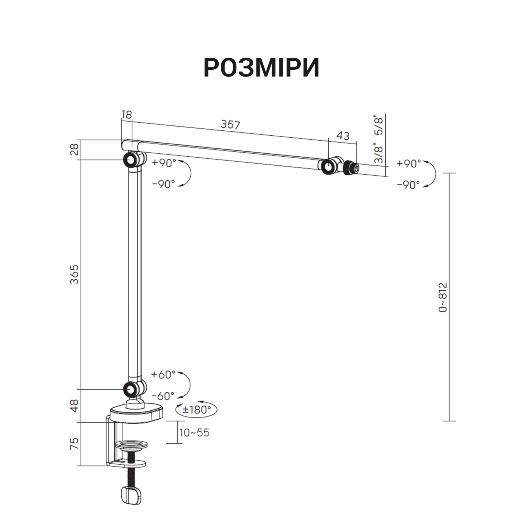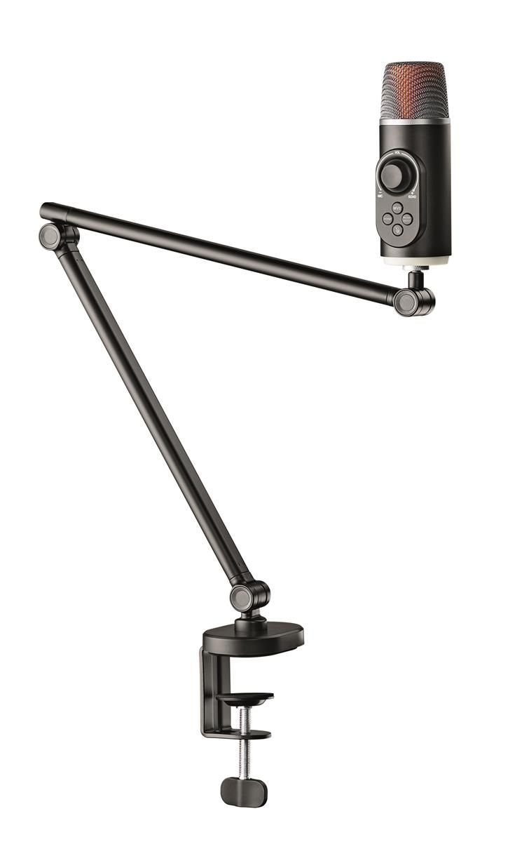 Тонкий мікрофонний пантограф має естетичну форму, яка надає стильного дизайну робочій зоні. Сумісний з будь-яким мікрофоном або кріпленням-павуком завдяки стандартному різьбленню 3/8", 5/8" та можливістю витримувати навантаження вагою до 1 кг. Кабель-менеджмент, що додається до комплекту, гарантує, що ваша установка акуратна, а його розширений діапазон і обертання дозволяють легко розташувати мікрофон саме там, де він повинен бути. Зробіть створення контенту більш простим та ефективним.
