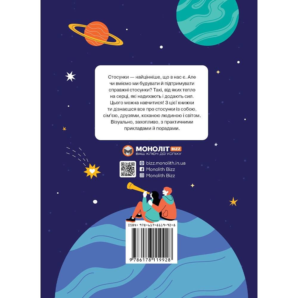 У цій книжці ви знайдете відповіді на всі ваші запитання про стосунки. Кожна сторінка розповість коротко й по суті про те, як полюбити себе, знайти друзів і близьку серцю людину, як розмовляти з батьками і влитися в компанію, як жити у злагоді із собою та людьми довкола.