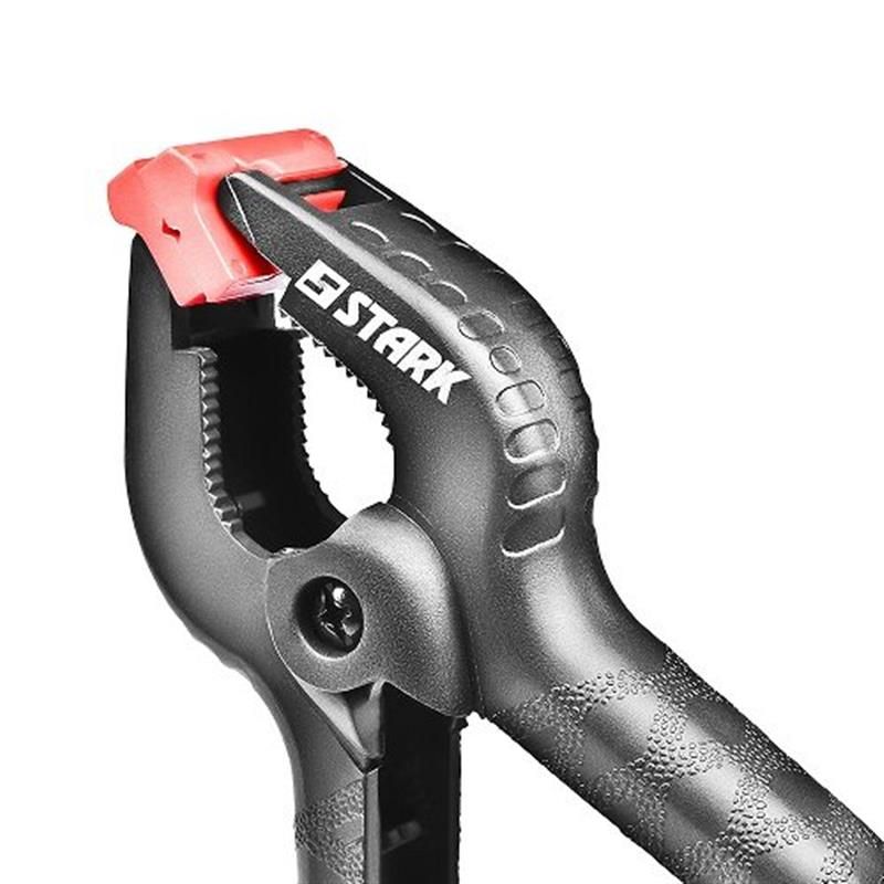 Пружинна струбцина Stark 50 мм виготовлена з якісного міцного пластику, який має довгий термін служби. На рукоятках спеціальне ребристе покриття, яке запобігає ковзанню під час затиску. Легкий і в той же час надійний механізм, розкриття і закриття губок дозволяє працювати однією рукою.