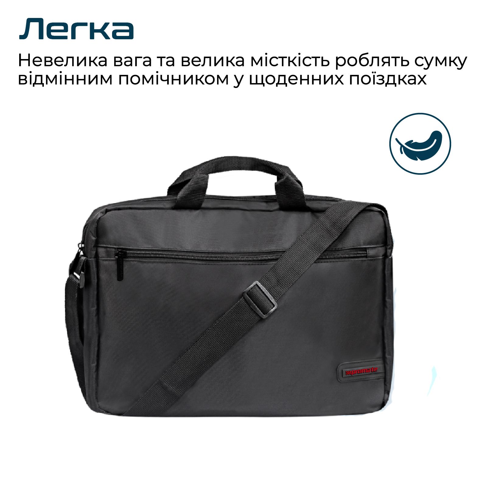 Функціональна: Відділення для 15.6’’ ноутбука та документів формату А4, зовнішня кишеня для канцелярських товарів та гаджетів, а також ремінь, що регулюється по довжині.