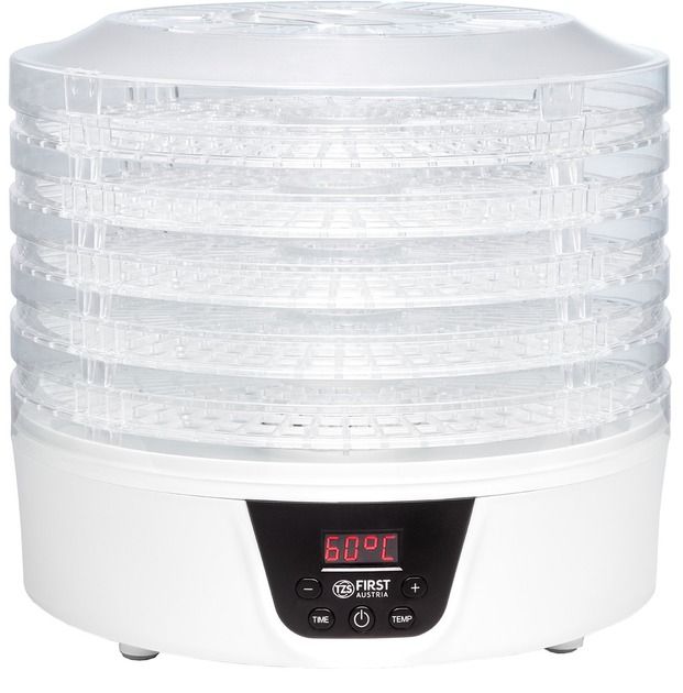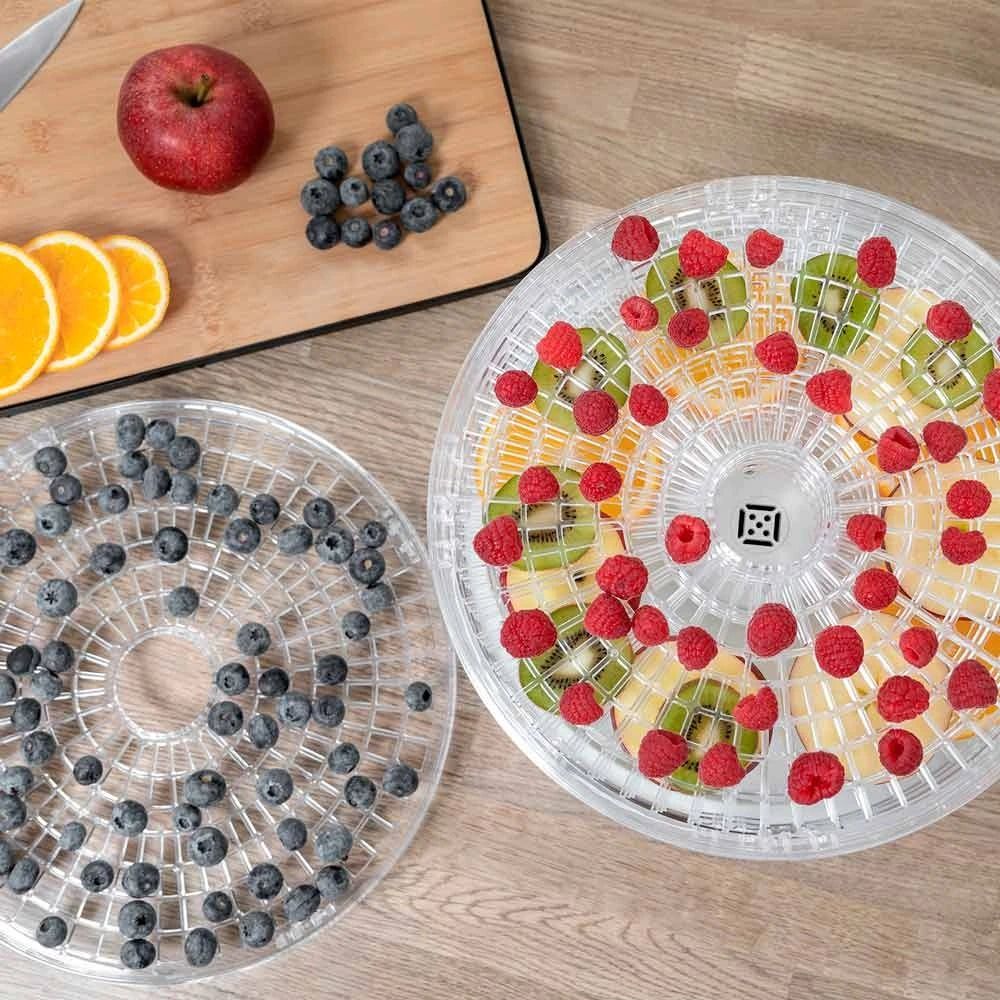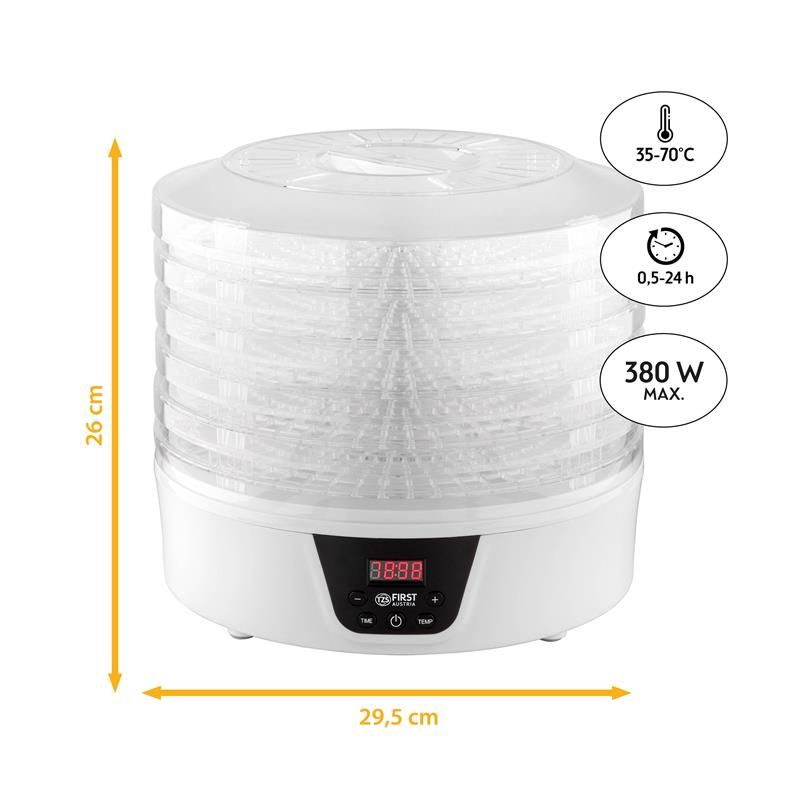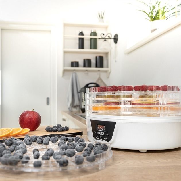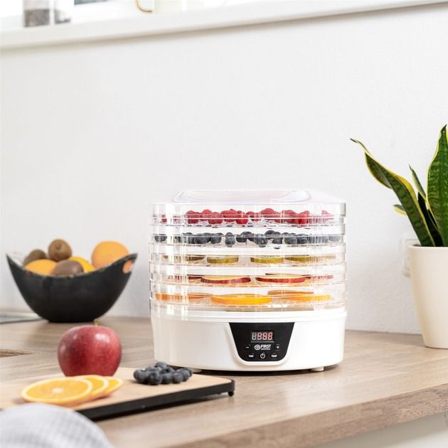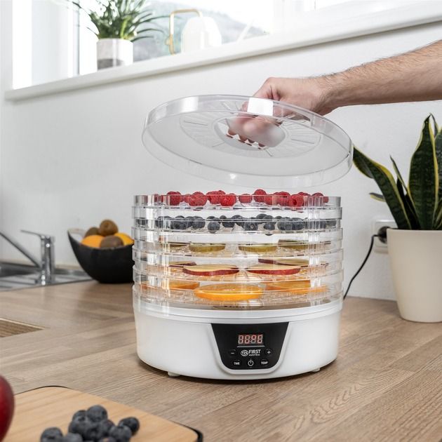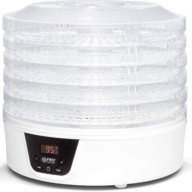 Не купуйте дорогі сухофрукти. Зробіть самі. Значно краще. Набагато дешевше. На п’яти полицях ви можете висушити все, що подобається вам і вашій родині, за допомогою практичного дегідратора. Як сухий перекус для офісу, в школу або як перекус на дорогу. Будь то фрукти, овочі чи м’ясо, процес сушіння працює повністю автоматично при температурі від 35°C до 70°C. Хороша річ у тому, що їжу, яка інакше залишилася, можна переробити та зберегти довше. Трави також можна сушити і переробляти в суміші спецій.
