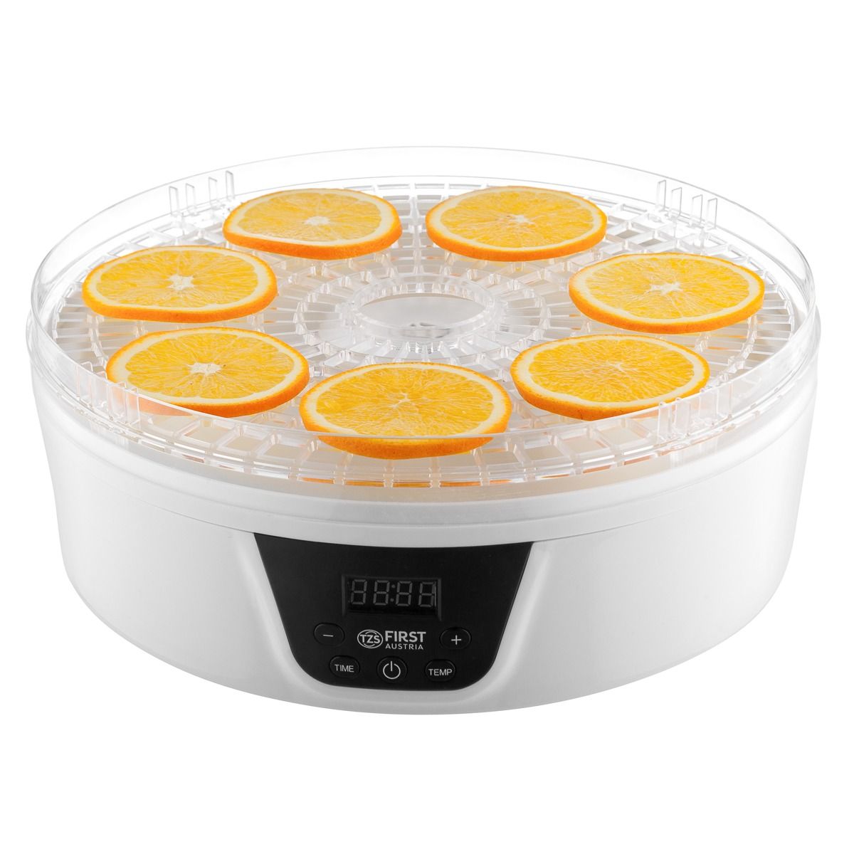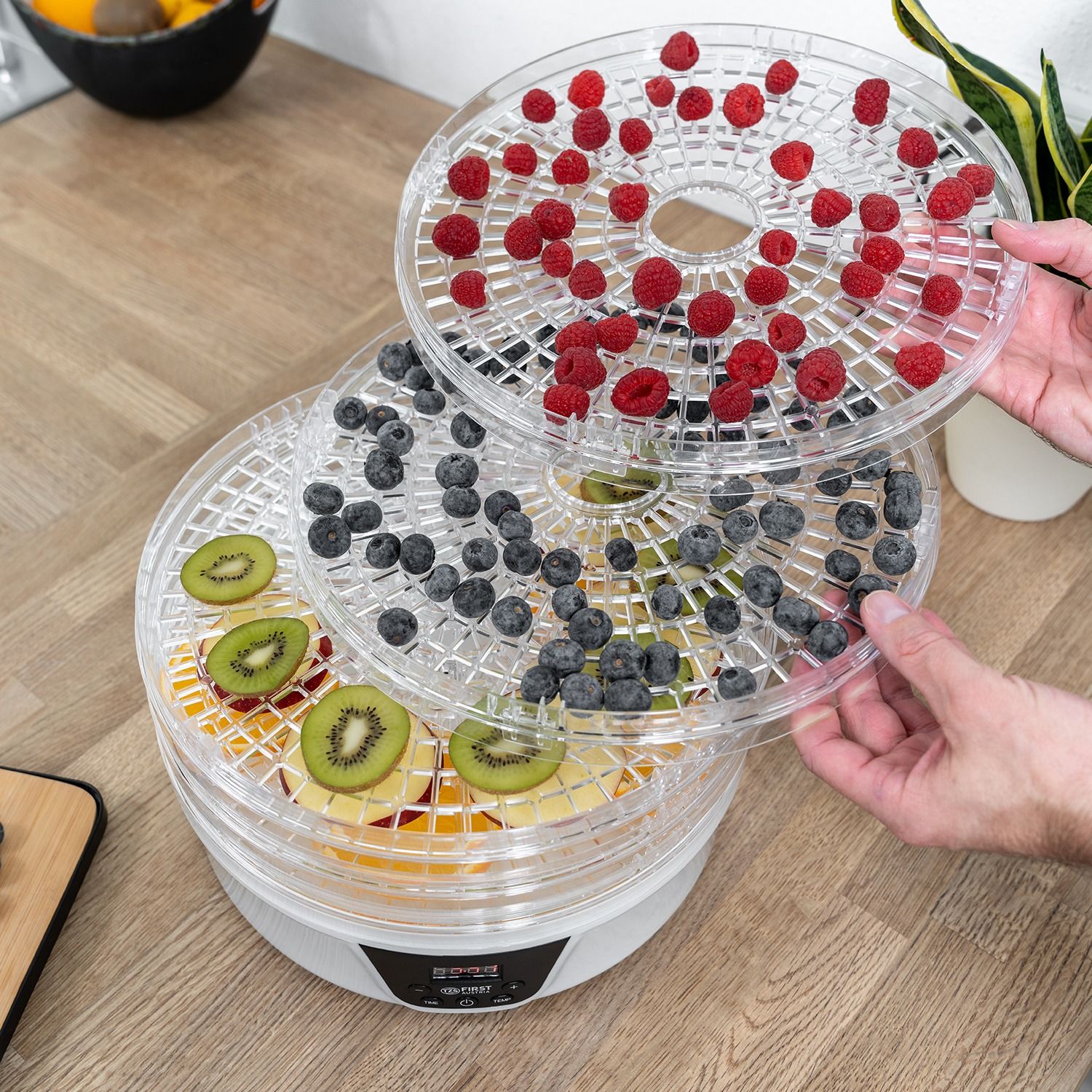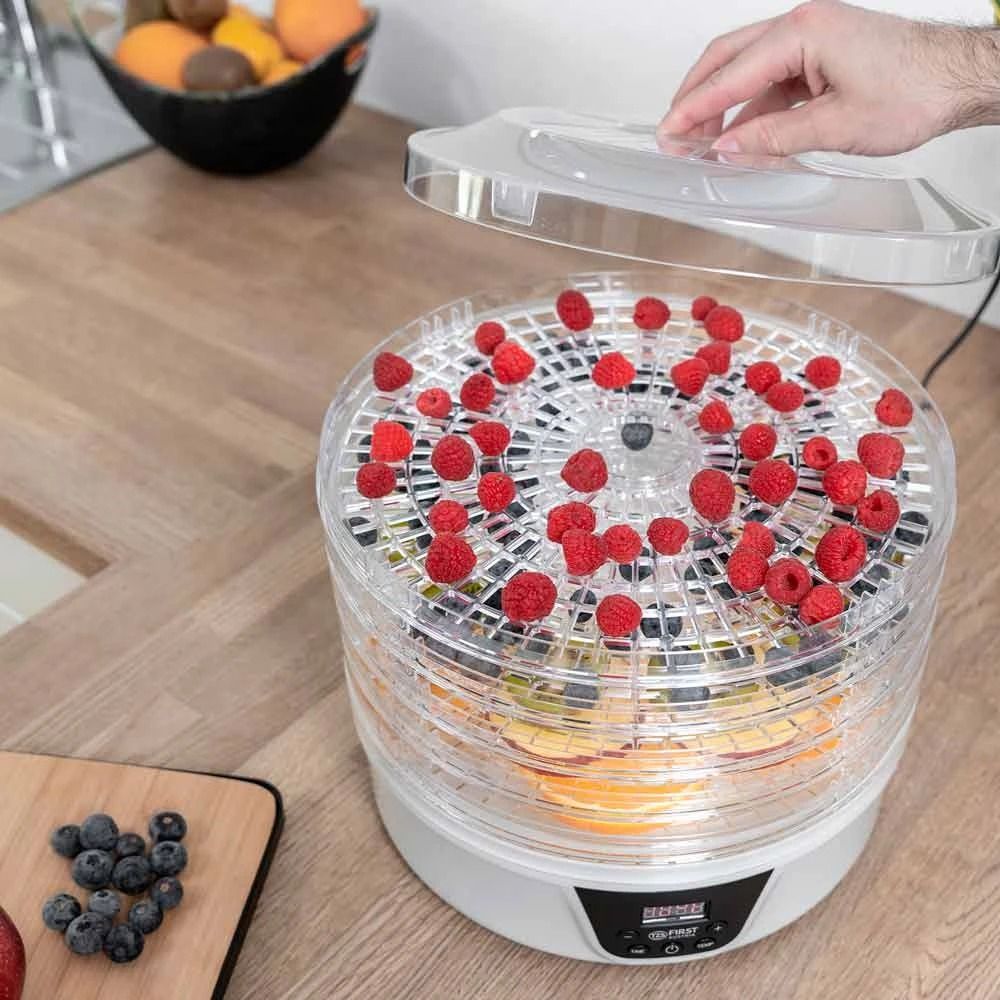 Не купуйте дорогі сухофрукти. Зробіть самі. Значно краще. Набагато дешевше. На п’яти полицях ви можете висушити все, що подобається вам і вашій родині, за допомогою практичного дегідратора. Як сухий перекус для офісу, в школу або як перекус на дорогу. Будь то фрукти, овочі чи м’ясо, процес сушіння працює повністю автоматично при температурі від 35°C до 70°C. Хороша річ у тому, що їжу, яка інакше залишилася, можна переробити та зберегти довше. Трави також можна сушити і переробляти в суміші спецій.