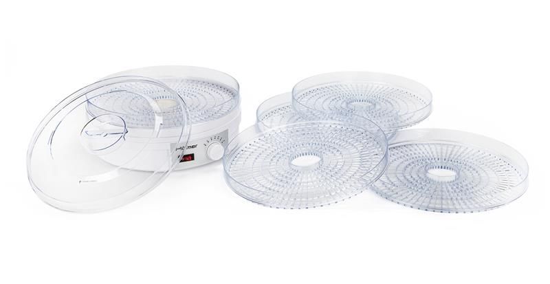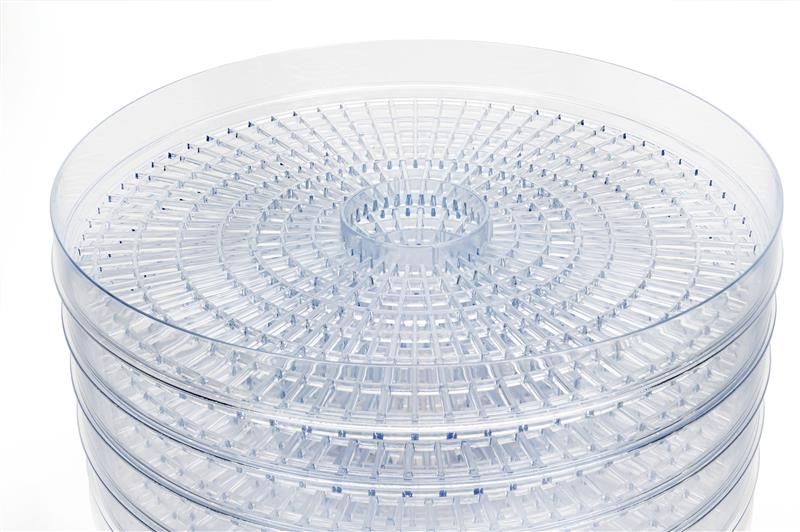 5 незалежних піддонів висотою 3 см і діаметром 32 см дозволяють викласти продукти в п’ять рівнів і сушити їх одночасно. Особливості конвекції перешкоджають змішуванню запахів, якщо ви сушите різні продукти одночасно. Сушіть овочі, фрукти, ягоди, лікувальні трави, домашні макаронні вироби, хліб, гриби, рибу й багато чого іншого. Для дрібних ягід передбачена спеціальна насадка. Також сушка дозволяє готувати домашню пастилу.