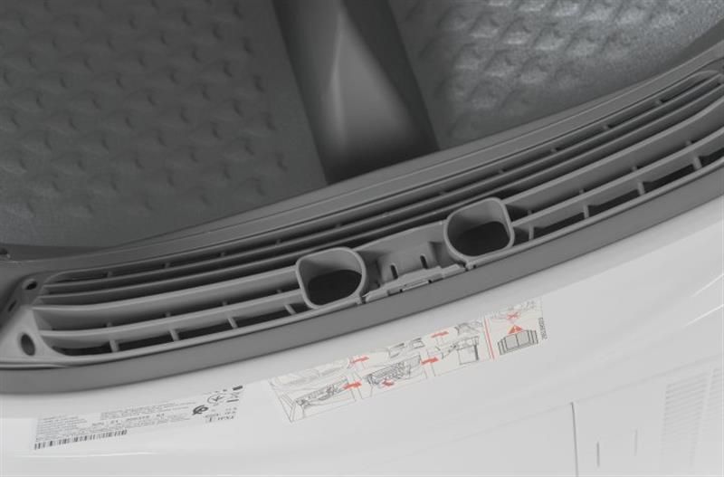 Для конденсаційного фільтра відведено спеціальний відсік внизу машинки. Він закривається окремими дверцятами. Цей фільтр виробник рекомендує промивати раз на місяць. Про необхідність процедури сушильна машина нагадає індикацією.