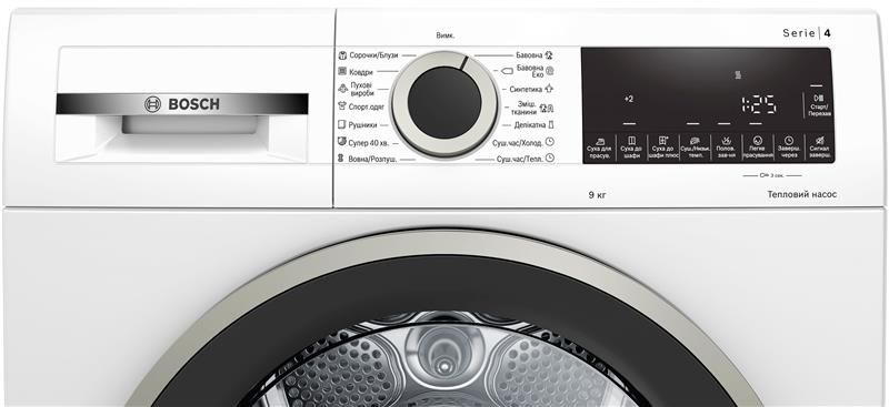 Програми:Бавовна Еко, Бавовна, Завершальне сушіння вовняних виробів, Змішана білизна, Програма з регульованим часом Пуховий одяг, Пухові ковдри, Рушники, Синтетика, Сорочки/блузки, Спортивний одяг, Супер 40, Тонкі тканини